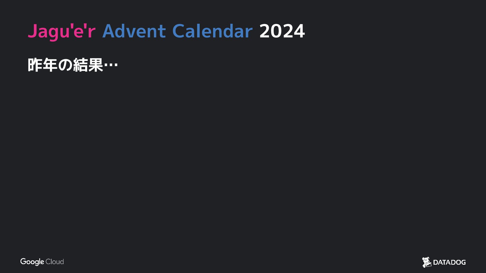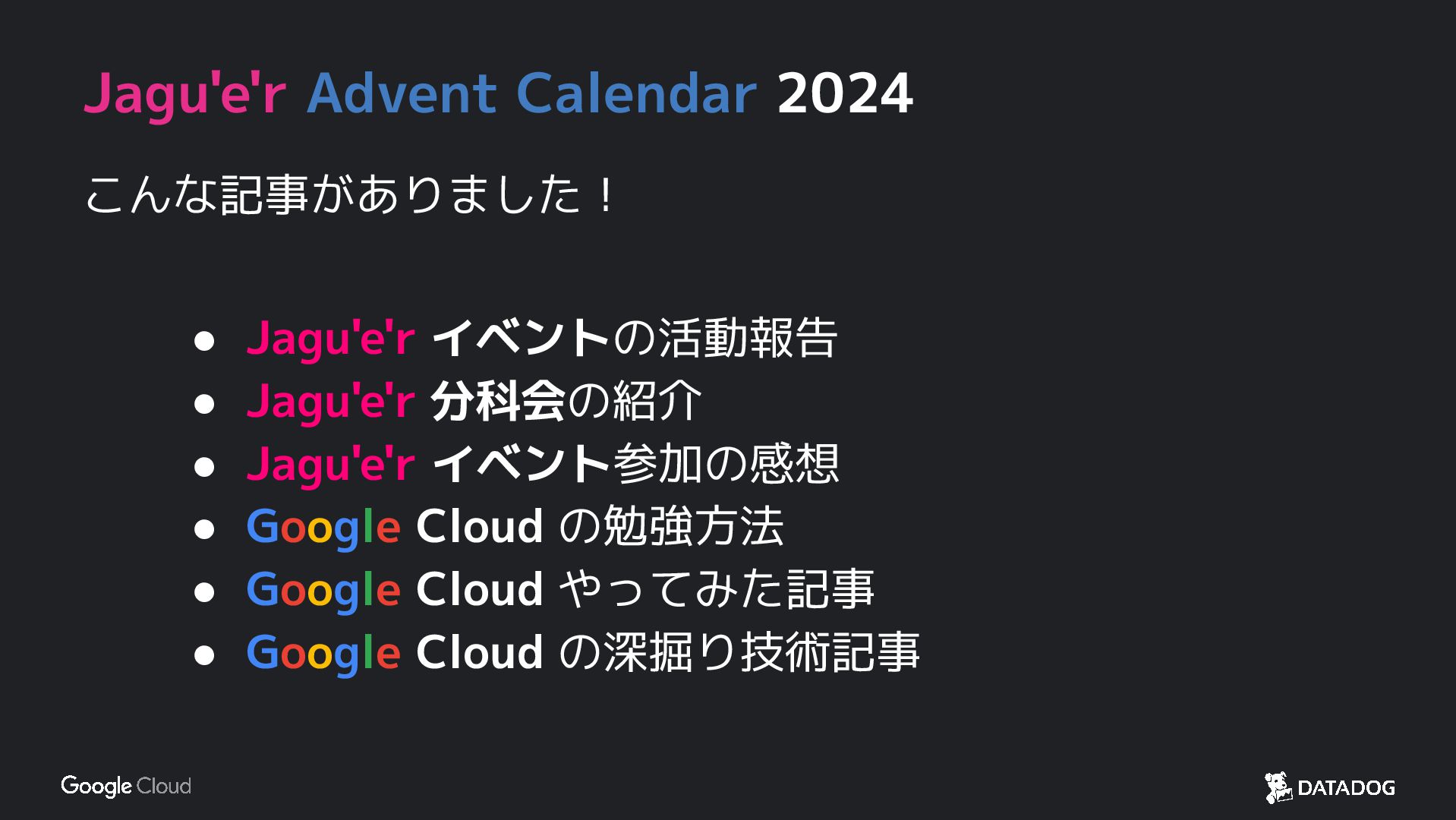 今年もやります!Jagu'e'r Advent Calendar Jagu'e'r コミュニティメンバー全員が参加できます!! 1 Google Cloud や Jagu'e'rコミュニティ・各分科会のテーマに