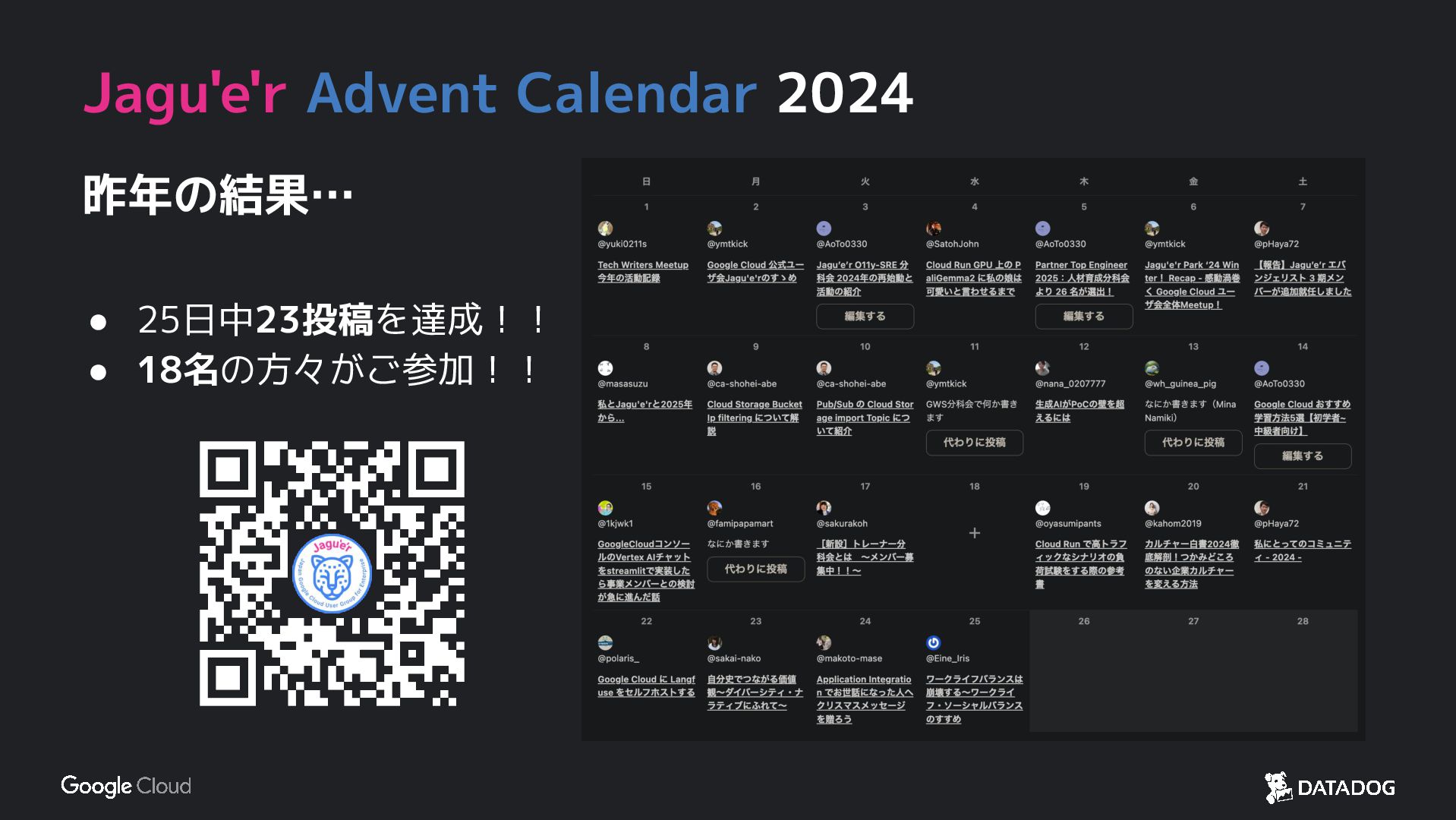 Jagu'e'r Advent Calendar 2024 昨年の結果… • 25日中23投稿を達成!! • 18名の方々がご参加!!