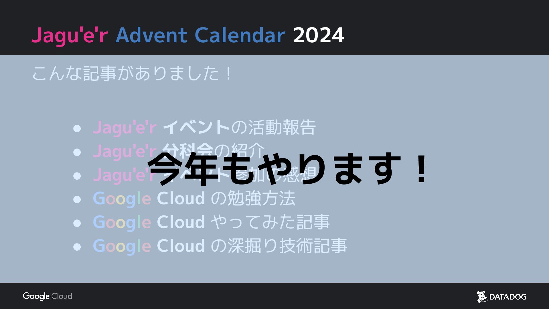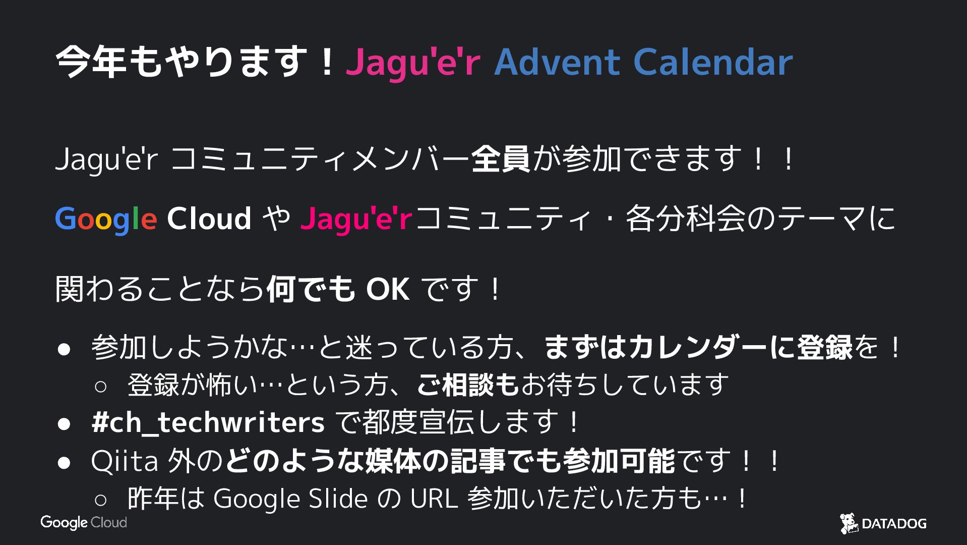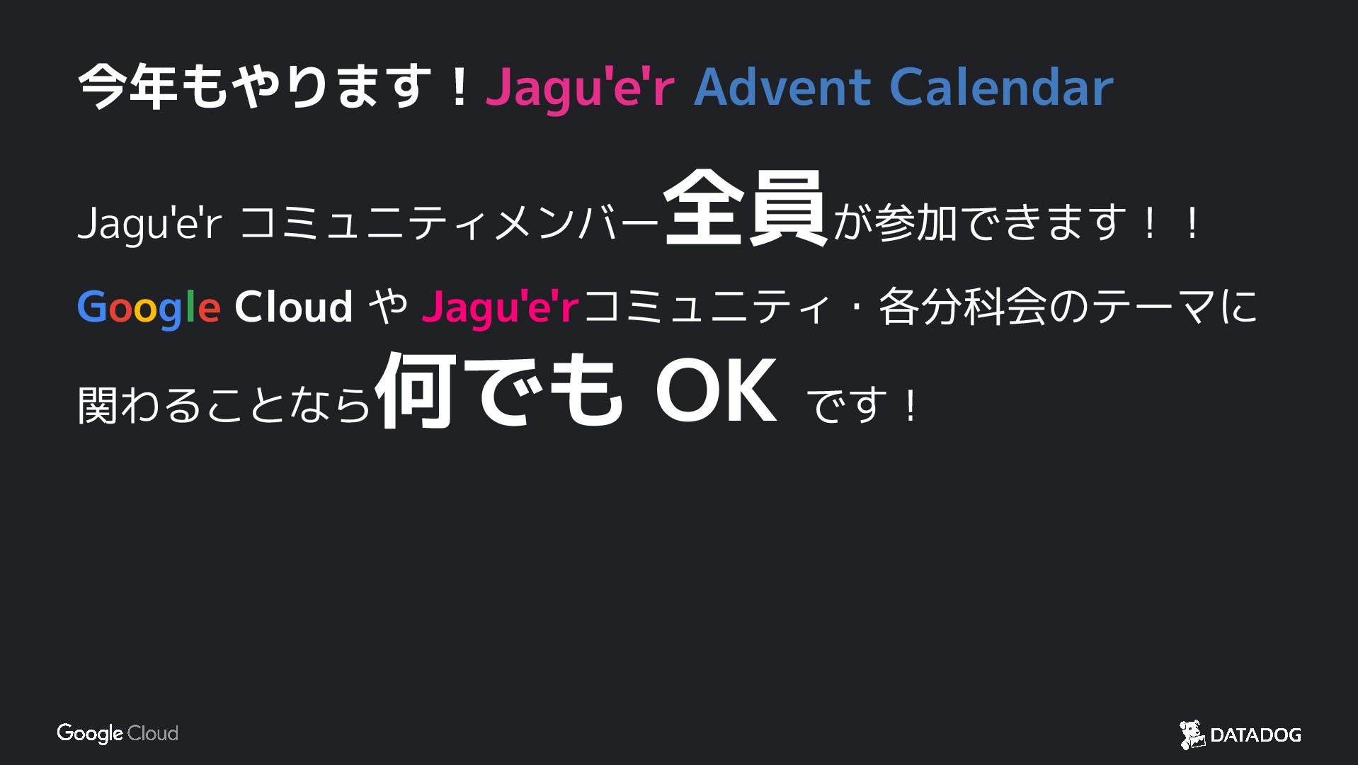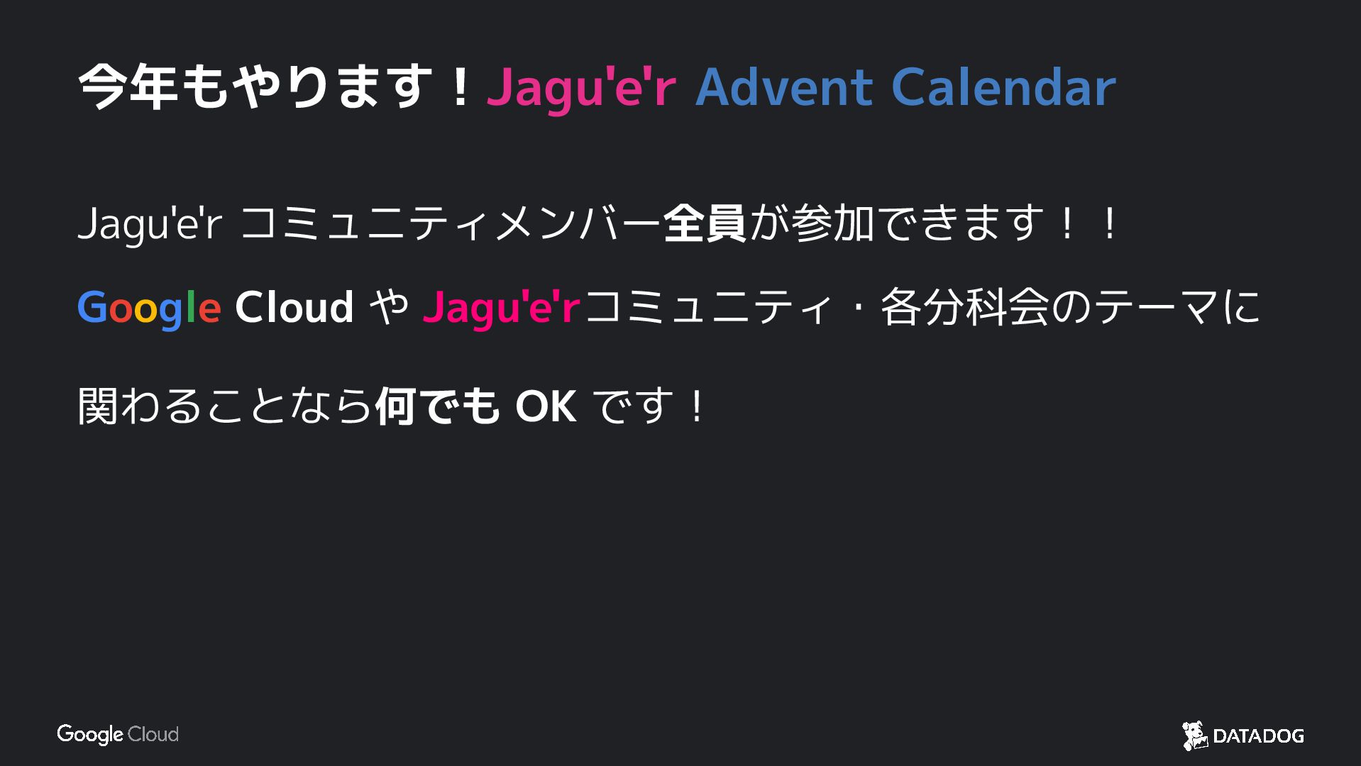 今年もやります!Jagu'e'r Advent Calendar Jagu'e'r コミュニティメンバー 全員が参加できます!! Google Cloud や Jagu'e'rコミュニティ・各分科会のテーマに
