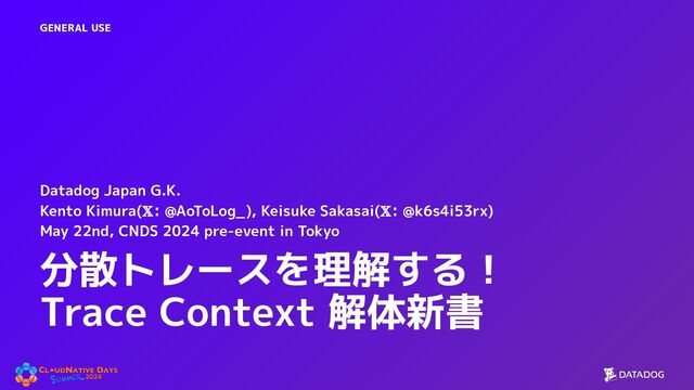 参考:"Ask Miss O11y: Baggage in OTel" honeycomb.io/blog/ask-miss-o11y-opentelemetry-baggage Baggage の利用について • コンテキスト伝播として baggage 使用 ◦ Baggage はキーバリュー形式のデータ構造 ◦ ヘッダ名は "baggage"。仕様は W3C Baggage に準拠 • ユースケース例 ◦ User IDs, Product IDs, and origin IPs ◦ feature flags の実装 otel.SetTextMapPropagator( propagation.NewCompositeTextMapPropagator( propagation.TraceContext{}, propagation.Baggage{}, ), ) opentelemetry.io/docs/concepts/signals/baggage/