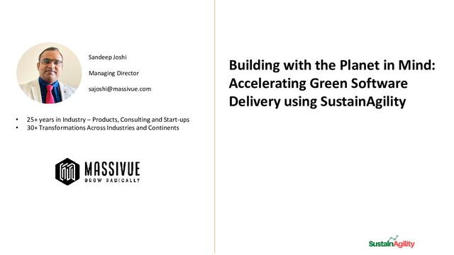 – Products, Consulting and Start-ups • 30+ Transformations Across Industries and Continents Building with the Planet in Mind: Accelerating Green Software Delivery using SustainAgility