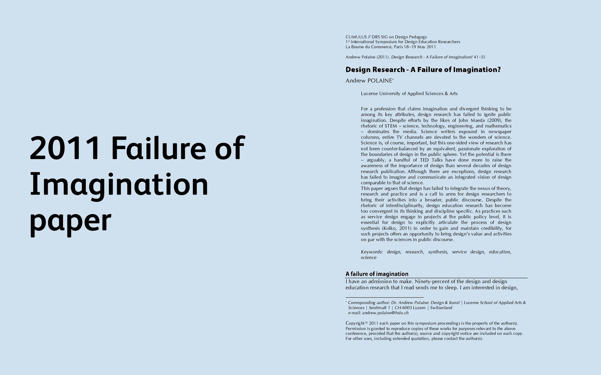 A revisit and reflection upon my 2011 paper titled *Design Research – A Failure of Imagination?* for the Design Literacy International Network. View the presentation [here](https://designliteracy.net/activities/andy-polaine/).