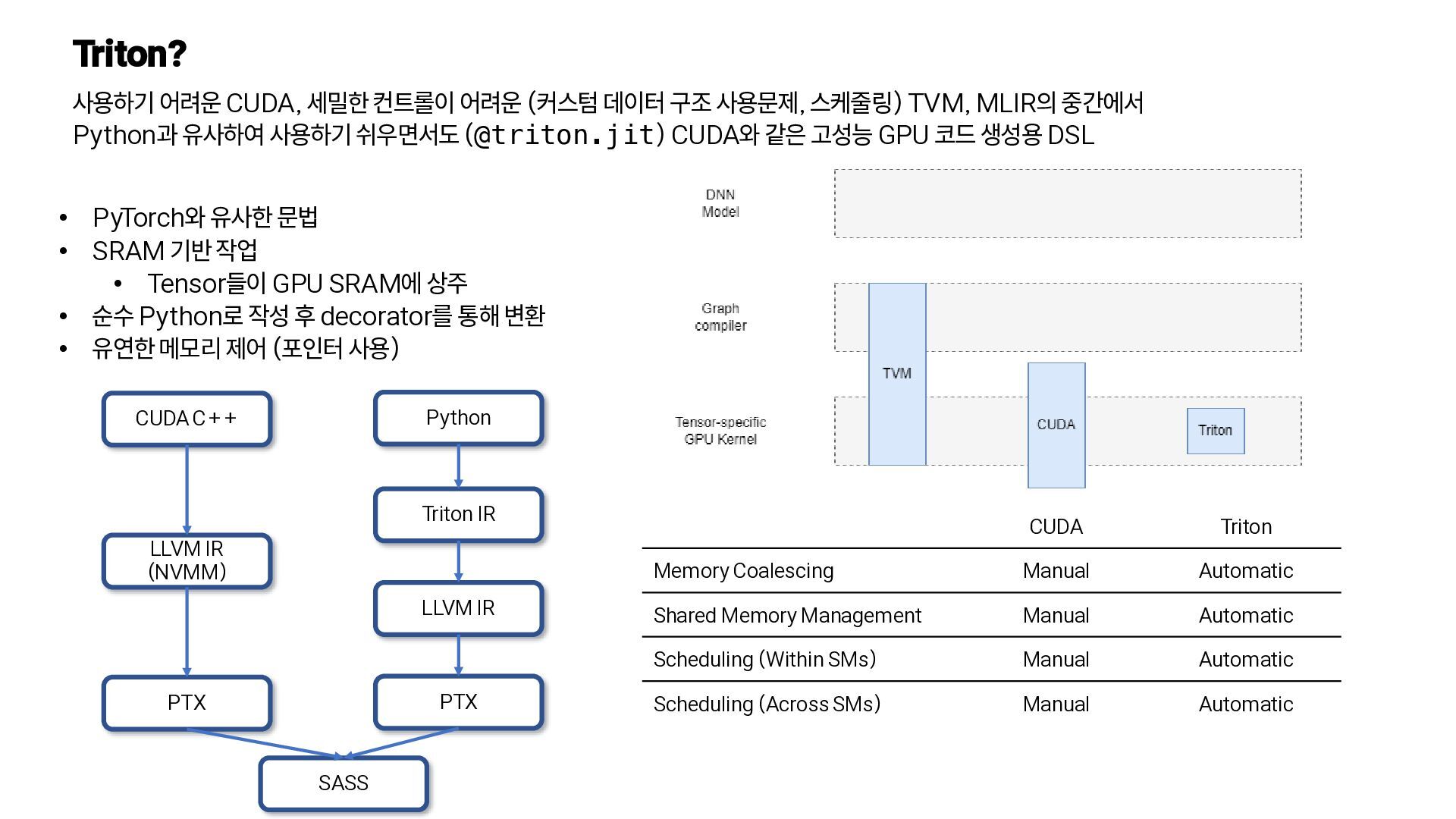 사용문제, 스케줄링) TVM, MLIR의 중간에서 Python과 유사하여 사용하기 쉬우면서도 (@triton.jit) CUDA와 같은 고성능 GPU 코드 생성용 DSL CUDA Triton Memory Coalescing Manual Automatic Shared Memory Management Manual Automatic Scheduling (Within SMs) Manual Automatic Scheduling (Across SMs) Manual Automatic • PyTorch와 유사한 문법 • SRAM 기반 작업 • Tensor들이 GPU SRAM에 상주 • 순수 Python로 작성 후 decorator를 통해 변환 • 유연한 메모리 제어 (포인터 사용) Python Triton IR LLVM IR PTX CUDA C++ LLVM IR (NVMM) PTX SASS