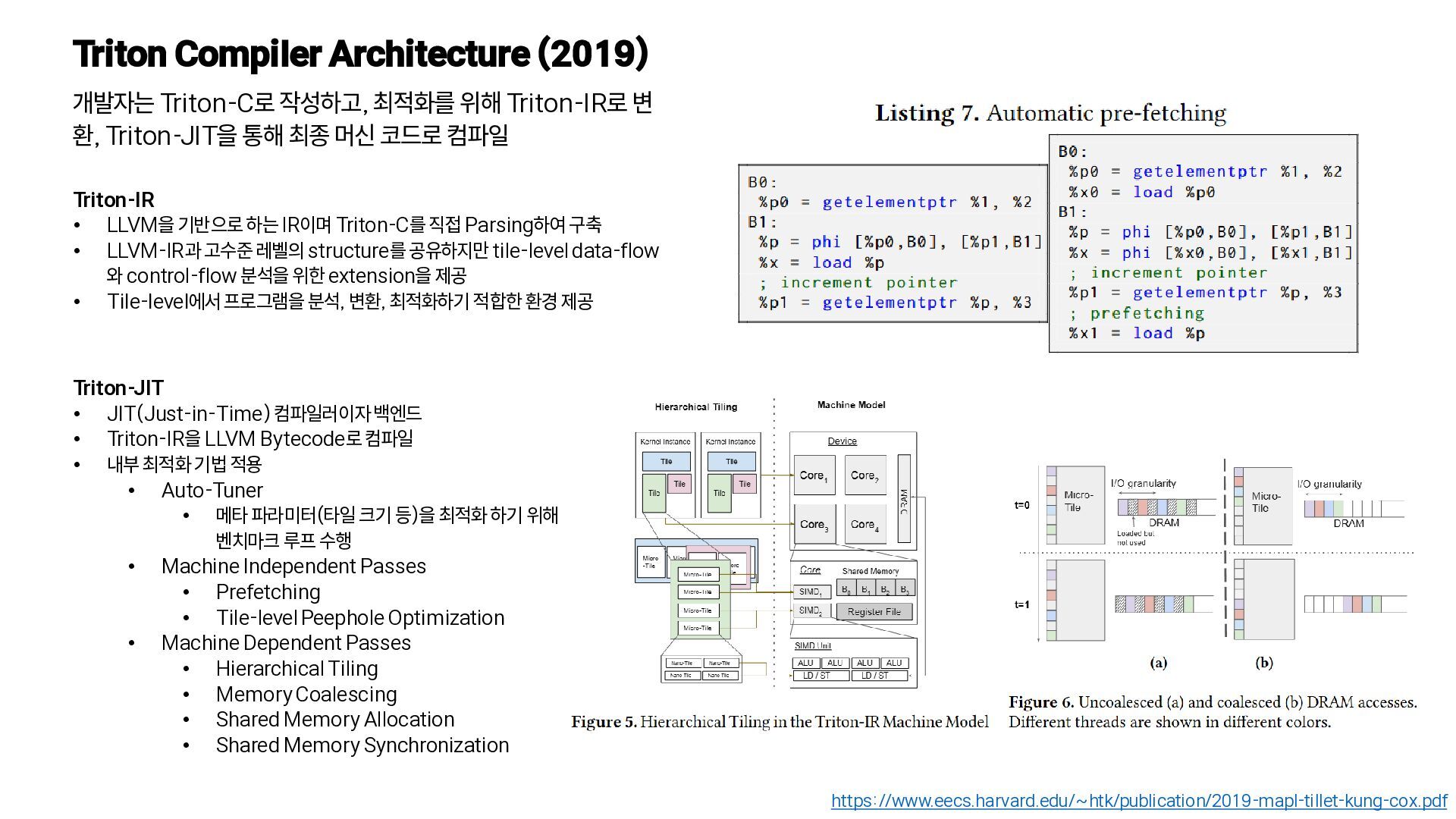 변 환, Triton-JIT을 통해 최종 머신 코드로 컴파일 https://www.eecs.harvard.edu/~htk/publication/2019-mapl-tillet-kung-cox.pdf Triton-IR • LLVM을 기반으로 하는 IR이며 Triton-C를 직접 Parsing하여 구축 • LLVM-IR과 고수준 레벨의 structure를 공유하지만 tile-level data-flow 와 control-flow 분석을 위한 extension을 제공 • Tile-level에서 프로그램을 분석, 변환, 최적화하기 적합한 환경 제공 Triton-JIT • JIT(Just-in-Time) 컴파일러이자 백엔드 • Triton-IR을 LLVM Bytecode로 컴파일 • 내부 최적화 기법 적용 • Auto-Tuner • 메타 파라미터(타일 크기 등)을 최적화 하기 위해 벤치마크 루프 수행 • Machine Independent Passes • Prefetching • Tile-level Peephole Optimization • Machine Dependent Passes • Hierarchical Tiling • Memory Coalescing • Shared Memory Allocation • Shared Memory Synchronization