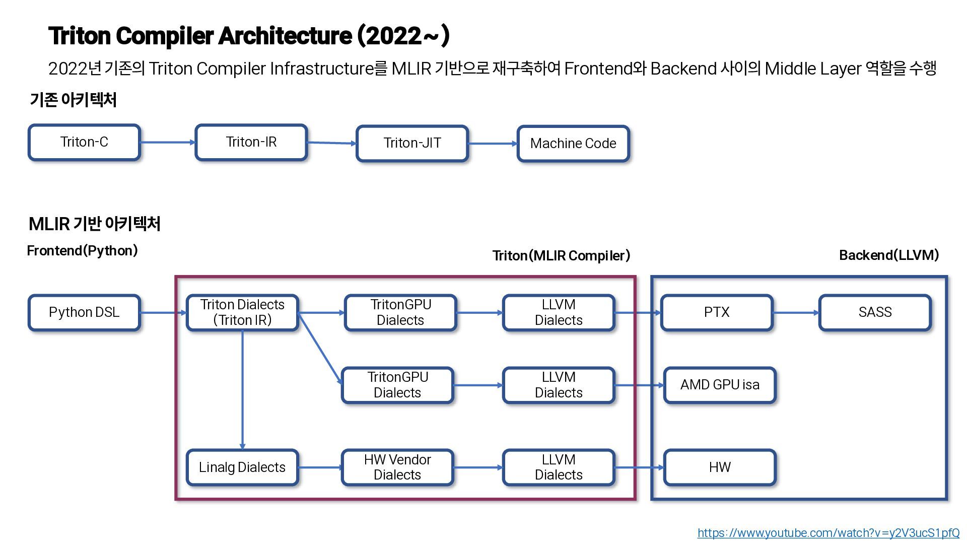 기반으로 재구축하여 Frontend와 Backend 사이의 Middle Layer 역할을 수행 https://www.youtube.com/watch?v=y2V3ucS1pfQ Python DSL Triton Dialects (Triton IR) LLVM Dialects PTX SASS Triton-C Triton-IR Triton-JIT Machine Code TritonGPU Dialects TritonGPU Dialects LLVM Dialects AMD GPU isa Linalg Dialects 기존 아키텍처 MLIR 기반 아키텍처 Triton(MLIR Compiler) Backend(LLVM) LLVM Dialects HW Vendor Dialects HW Frontend(Python)