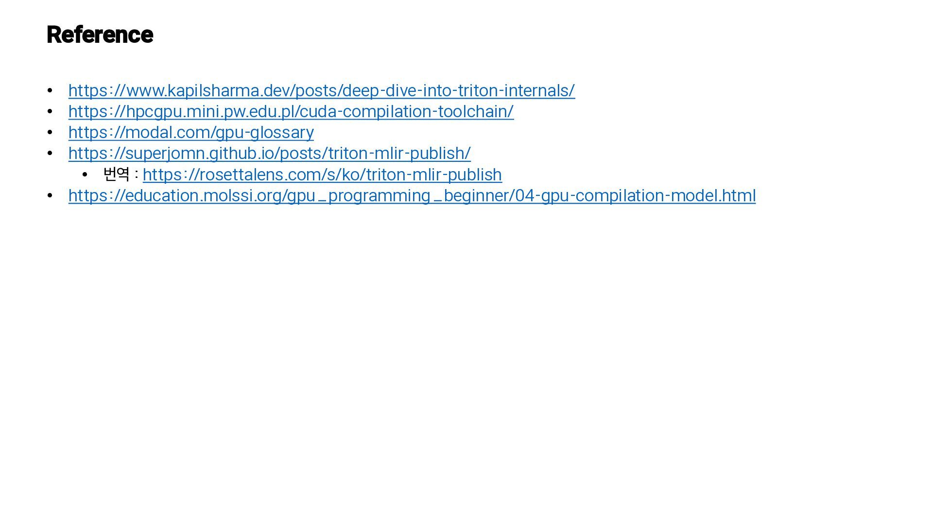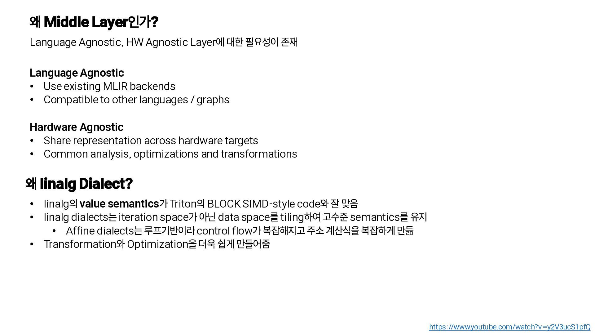존재 https://www.youtube.com/watch?v=y2V3ucS1pfQ Language Agnostic • Use existing MLIR backends • Compatible to other languages / graphs Hardware Agnostic • Share representation across hardware targets • Common analysis, optimizations and transformations 왜 linalg Dialect? • linalg의 value semantics가 Triton의 BLOCK SIMD-style code와 잘 맞음 • linalg dialects는 iteration space가 아닌 data space를 tiling하여 고수준 semantics를 유지 • Affine dialects는 루프기반이라 control flow가 복잡해지고 주소 계산식을 복잡하게 만듦 • Transformation와 Optimization을 더욱 쉽게 만들어줌