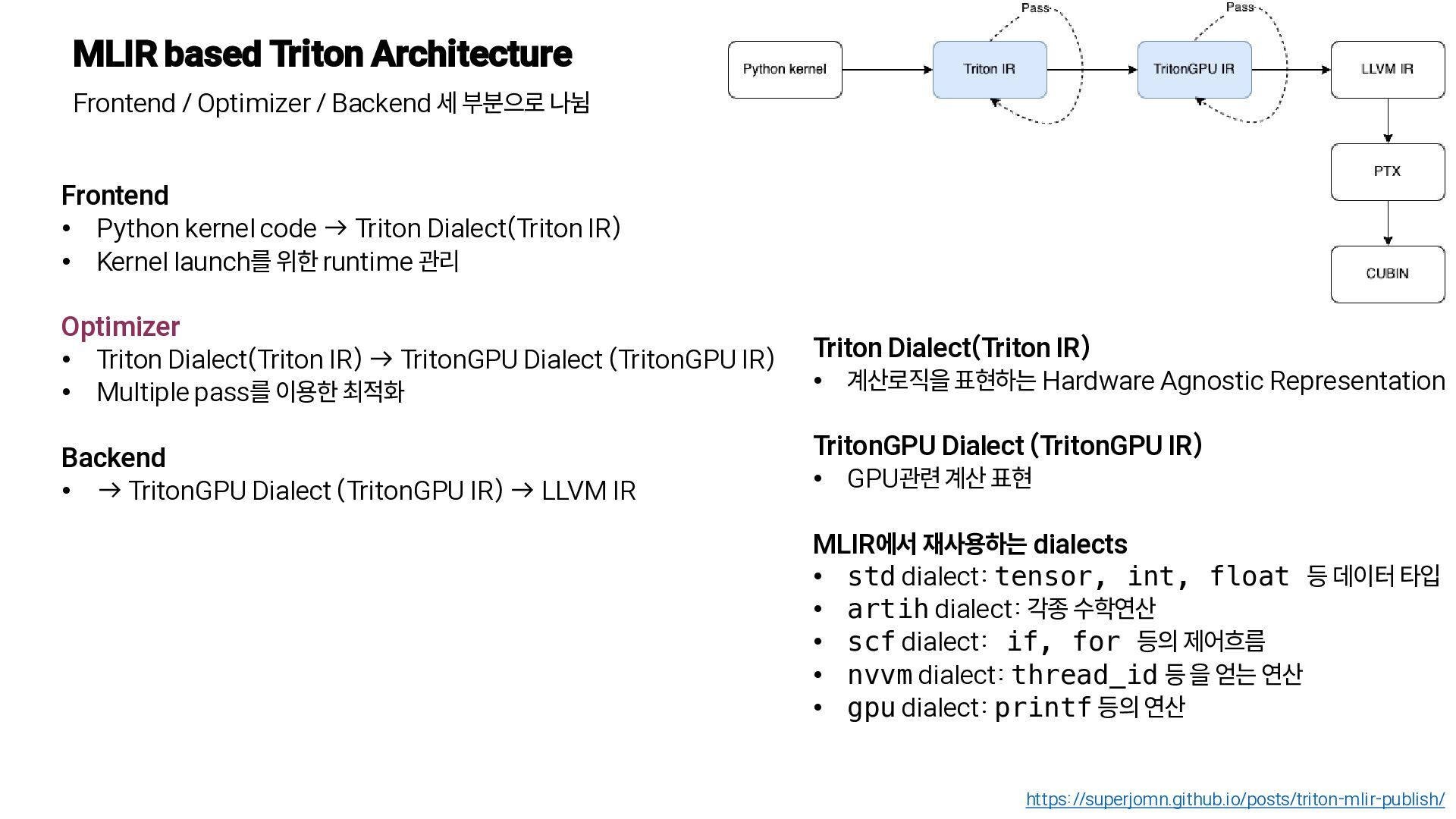 부분으로 나뉨 https://superjomn.github.io/posts/triton-mlir-publish/ Frontend • Python kernel code → Triton Dialect(Triton IR) • Kernel launch를 위한 runtime 관리 Optimizer • Triton Dialect(Triton IR) → TritonGPU Dialect (TritonGPU IR) • Multiple pass를 이용한 최적화 Backend • → TritonGPU Dialect (TritonGPU IR) → LLVM IR Triton Dialect(Triton IR) • 계산로직을 표현하는 Hardware Agnostic Representation TritonGPU Dialect (TritonGPU IR) • GPU관련 계산 표현 MLIR에서 재사용하는 dialects • std dialect: tensor, int, float 등 데이터 타입 • artih dialect: 각종 수학연산 • scf dialect: if, for 등의 제어흐름 • nvvm dialect: thread_id 등 을 얻는 연산 • gpu dialect: printf 등의 연산