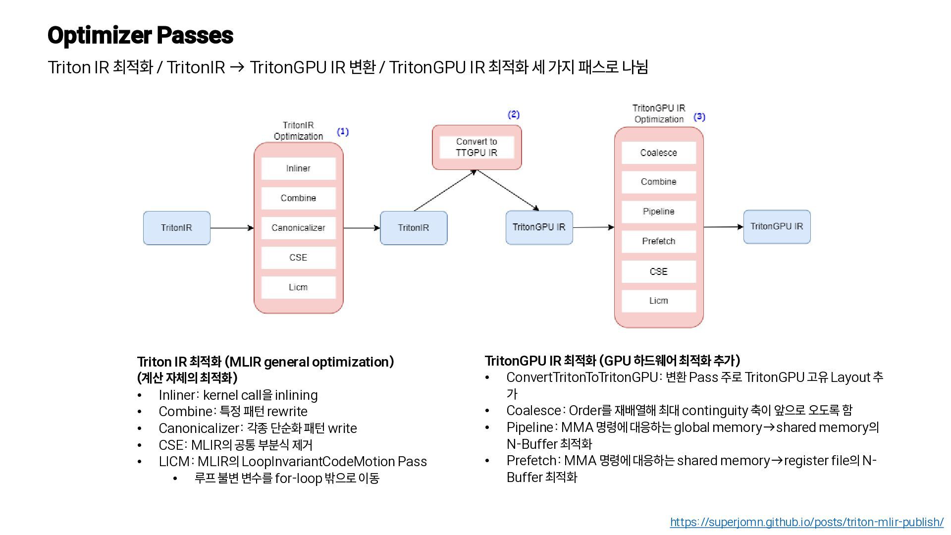 변환 / TritonGPU IR 최적화 세 가지 패스로 나뉨 https://superjomn.github.io/posts/triton-mlir-publish/ Triton IR 최적화 (MLIR general optimization) (계산 자체의 최적화) • Inliner: kernel call을 inlining • Combine: 특정 패턴 rewrite • Canonicalizer: 각종 단순화 패턴 write • CSE: MLIR의 공통 부분식 제거 • LICM: MLIR의 LoopInvariantCodeMotion Pass • 루프 불변 변수를 for-loop 밖으로 이동 TritonGPU IR 최적화 (GPU 하드웨어 최적화 추가) • ConvertTritonToTritonGPU: 변환 Pass 주로 TritonGPU 고유 Layout 추 가 • Coalesce: Order를 재배열해 최대 continguity 축이 앞으로 오도록 함 • Pipeline: MMA 명령에 대응하는 global memory→shared memory의 N-Buffer 최적화 • Prefetch: MMA 명령에 대응하는 shared memory→register file의 N- Buffer 최적화
