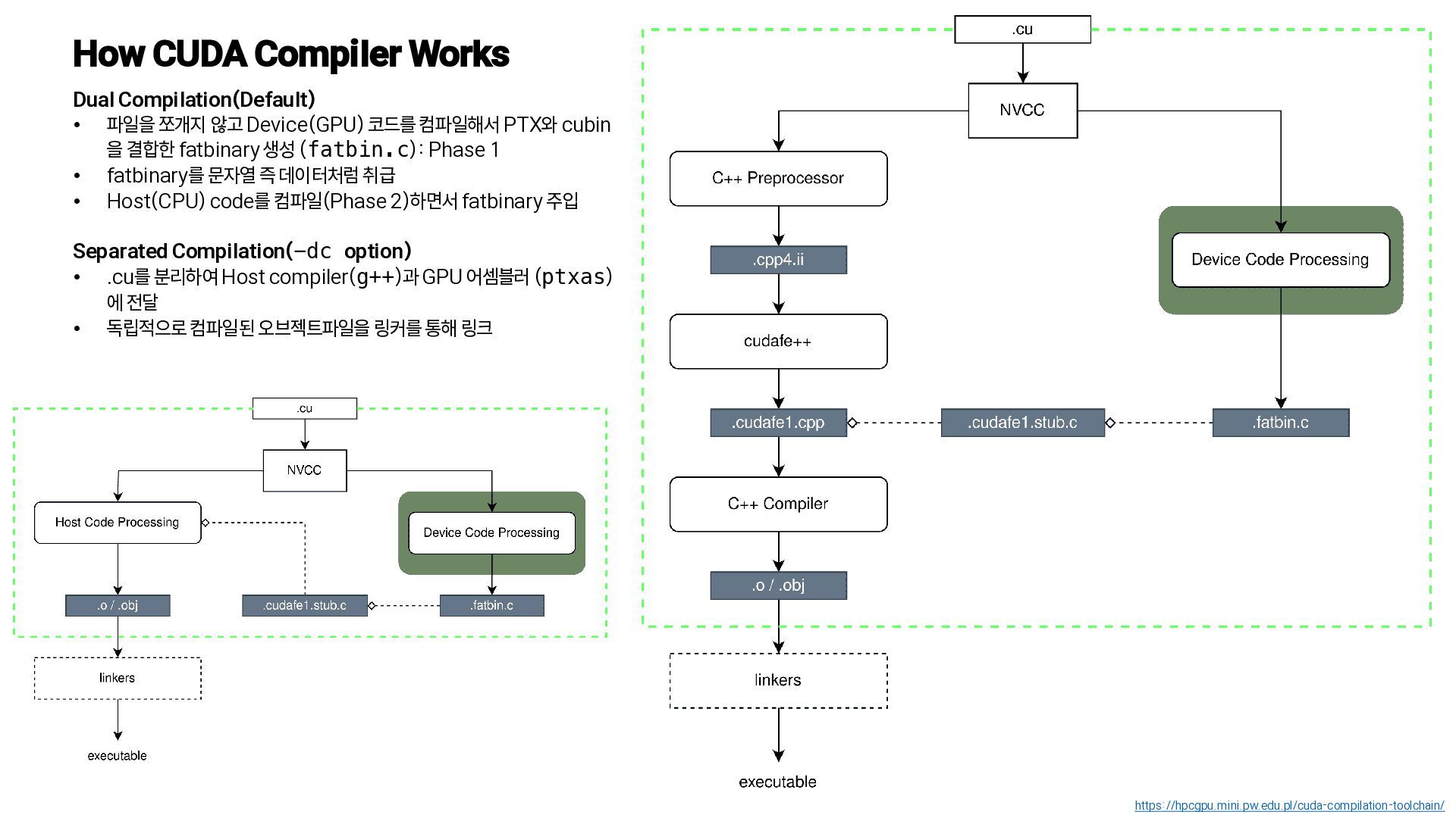 Device(GPU) 코드를 컴파일해서 PTX와 cubin 을 결합한 fatbinary 생성 (fatbin.c): Phase 1 • fatbinary를 문자열 즉 데이터처럼 취급 • Host(CPU) code를 컴파일(Phase 2)하면서 fatbinary 주입 Separated Compilation(-dc option) • .cu를 분리하여 Host compiler(g++)과 GPU 어셈블러 (ptxas) 에 전달 • 독립적으로 컴파일된 오브젝트파일을 링커를 통해 링크 https://hpcgpu.mini.pw.edu.pl/cuda-compilation-toolchain/