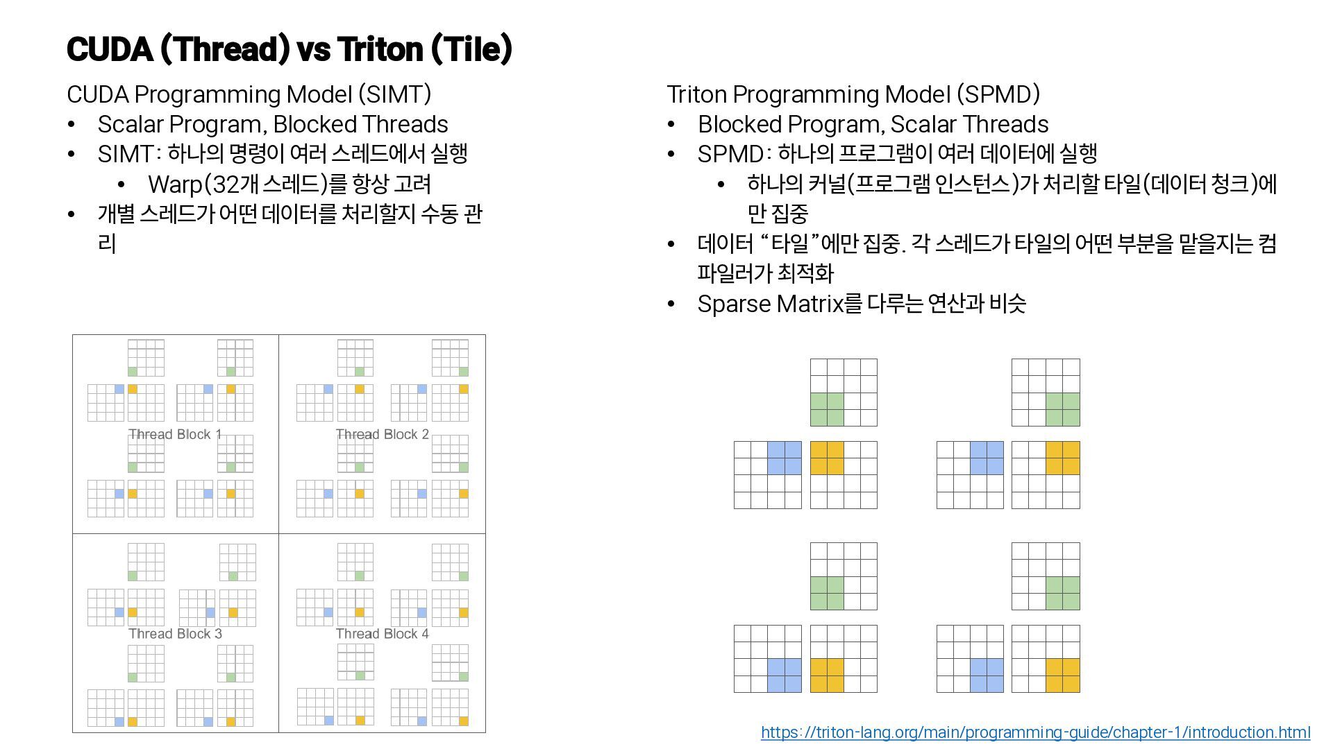 Scalar Program, Blocked Threads • SIMT: 하나의 명령이 여러 스레드에서 실행 • Warp(32개 스레드)를 항상 고려 • 개별 스레드가 어떤 데이터를 처리할지 수동 관 리 https://triton-lang.org/main/programming-guide/chapter-1/introduction.html Triton Programming Model (SPMD) • Blocked Program, Scalar Threads • SPMD: 하나의 프로그램이 여러 데이터에 실행 • 하나의 커널(프로그램 인스턴스)가 처리할 타일(데이터 청크)에 만 집중 • 데이터 “타일”에만 집중. 각 스레드가 타일의 어떤 부분을 맡을지는 컴 파일러가 최적화 • Sparse Matrix를 다루는 연산과 비슷