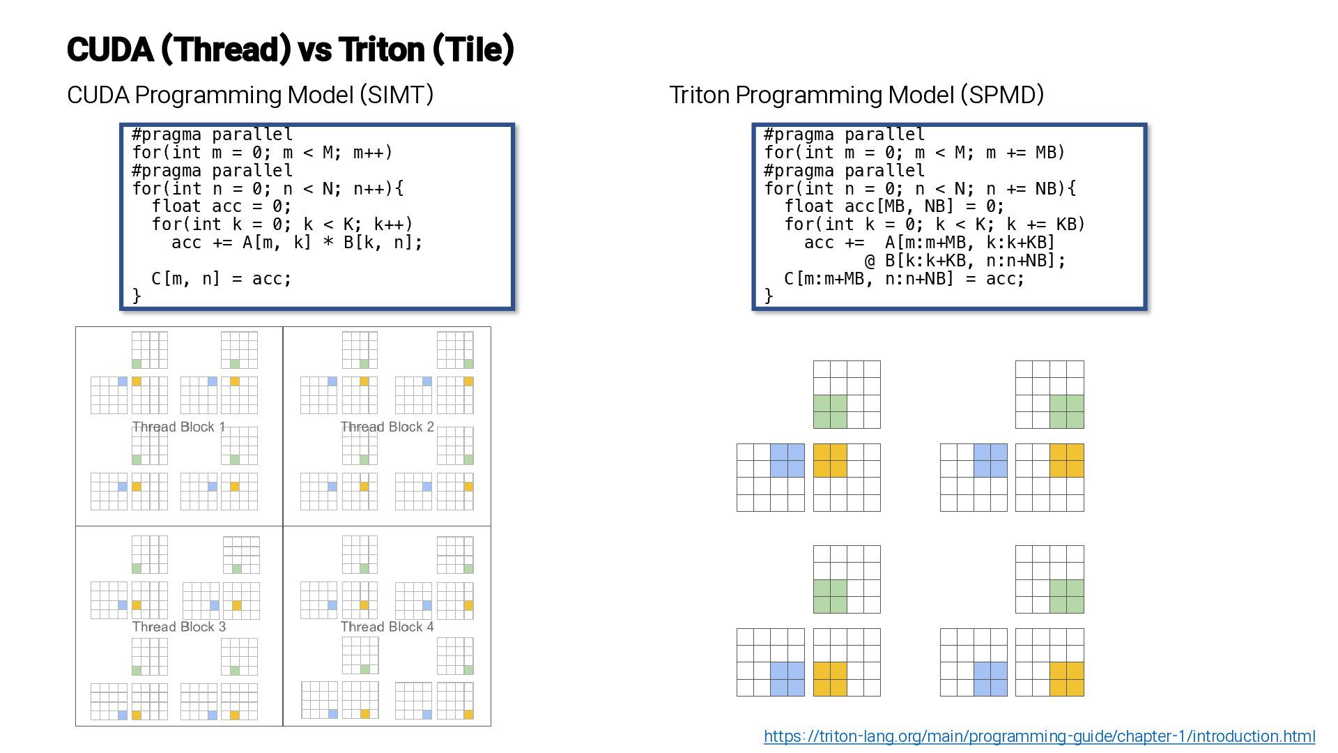 Triton Programming Model (SPMD) #pragma parallel for(int m = 0; m < M; m++) #pragma parallel for(int n = 0; n < N; n++){ float acc = 0; for(int k = 0; k < K; k++) acc += A[m, k] * B[k, n]; C[m, n] = acc; } #pragma parallel for(int m = 0; m < M; m += MB) #pragma parallel for(int n = 0; n < N; n += NB){ float acc[MB, NB] = 0; for(int k = 0; k < K; k += KB) acc += A[m:m+MB, k:k+KB] @ B[k:k+KB, n:n+NB]; C[m:m+MB, n:n+NB] = acc; }