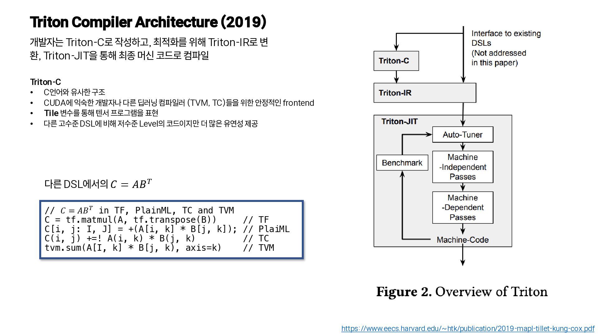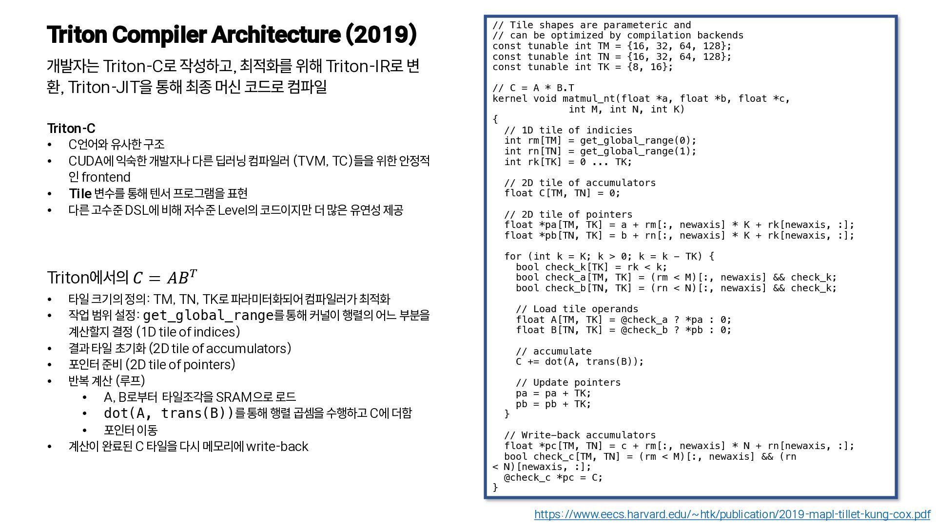 변 환, Triton-JIT을 통해 최종 머신 코드로 컴파일 https://www.eecs.harvard.edu/~htk/publication/2019-mapl-tillet-kung-cox.pdf Triton-C • C언어와 유사한 구조 • CUDA에 익숙한 개발자나 다른 딥러닝 컴파일러 (TVM, TC)들을 위한 안정적인 frontend • Tile 변수를 통해 텐서 프로그램을 표현 • 다른 고수준 DSL에 비해 저수준 Level의 코드이지만 더 많은 유연성 제공 // 𝐶 = 𝐴𝐵𝑇 in TF, PlainML, TC and TVM C = tf.matmul(A, tf.transpose(B)) // TF C[i, j: I, J] = +(A[i, k] * B[j, k]); // PlaiML C(i, j) +=! A(i, k) * B(j, k) // TC tvm.sum(A[I, k] * B[j, k), axis=k) // TVM 다른 DSL에서의 𝐶 = 𝐴𝐵𝑇