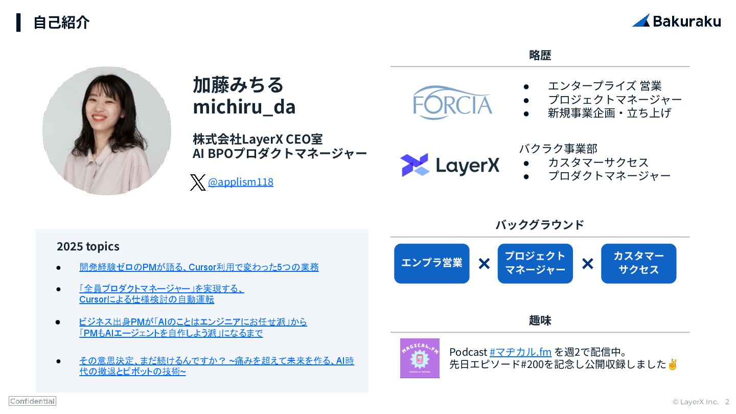BPOプロダクトマネージャー 略歴 • エンタープライズ 営業 • プロジェクトマネージャー • 新規事業企画‧⽴ち上げ @applism118 バクラク事業部 • カスタマーサクセス • プロダクトマネージャー プロジェクト マネージャー エンプラ営業 カスタマー サクセス バックグラウンド Podcast #マヂカル.fm を週2で配信中。 先⽇エピソード#200を記念し公開収録しました✌ • 開発経験ゼロのPMが語る、Cursor利用で変わった5つの業務 • 「全員プロダクトマネージャー」を実現する、 Cursorによる仕様検討の自動運転 • ビジネス出身PMが「AIのことはエンジニアにお任せ派」から 「PMもAIエージェントを自作しよう派」になるまで • その意思決定、まだ続けるんですか? ~痛みを超えて未来を作る、AI時 代の撤退とピボットの技術~ 2025 topics 趣味