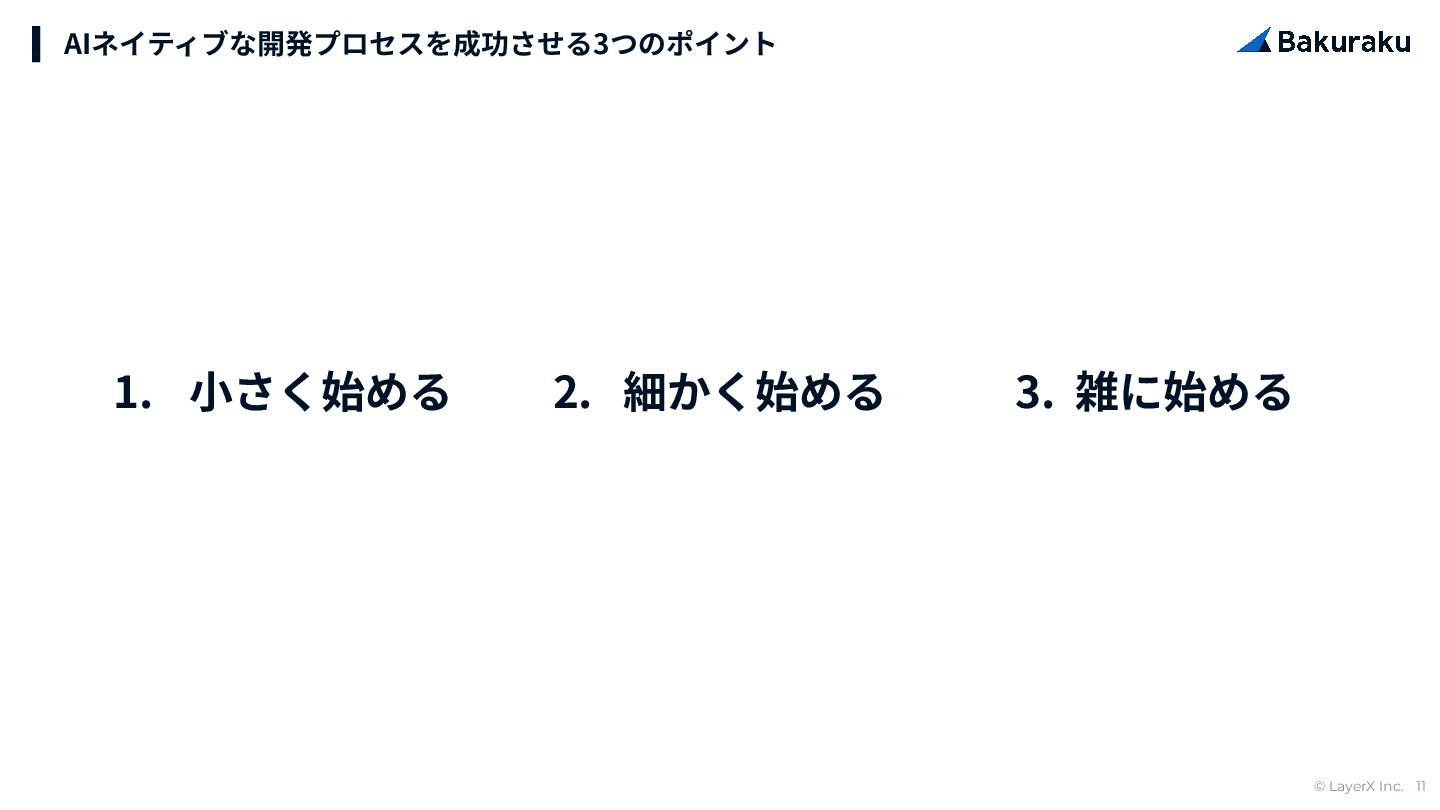 © LayerX Inc. 11 2. 細かく始める 1. ⼩さく始める AIネイティブな開発プロセスを成功させる3つのポイント 3.