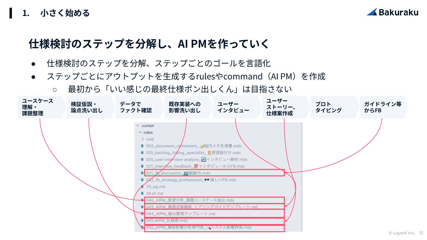 © LayerX Inc. 12 1. ⼩さく始める • 仕様検討のステップを分解、ステップごとのゴールを⾔語化 • ステップごとにアウトプットを⽣成するrulesやcommand(AI