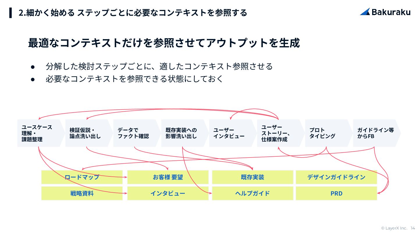 © LayerX Inc. 14 • 分解した検討ステップごとに、適したコンテキスト参照させる • 必要なコンテキストを参照できる状態にしておく 2.細かく始める ステップごとに必要なコンテキストを参照する