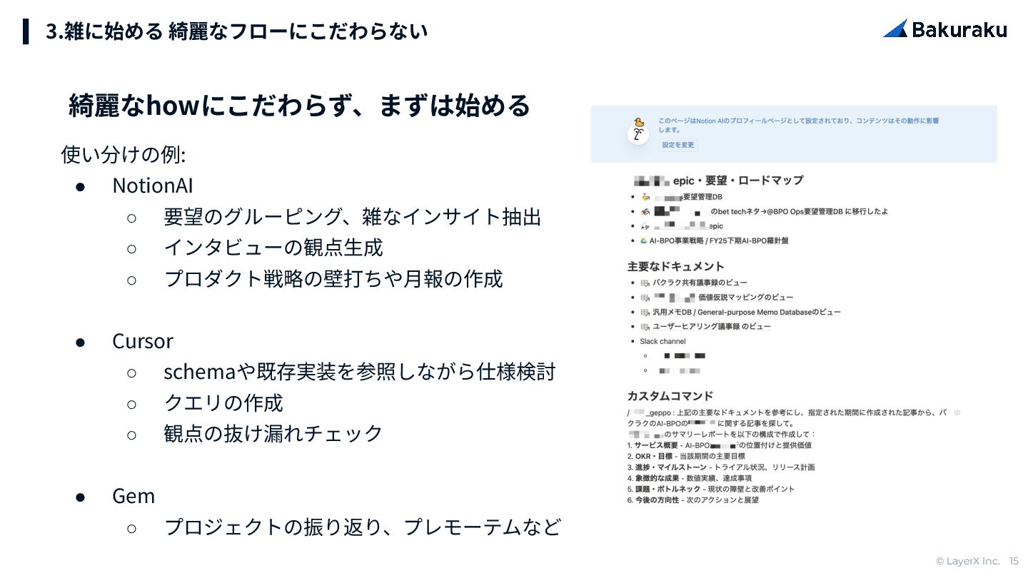 © LayerX Inc. 15 使い分けの例: • NotionAI ◦ 要望のグルーピング、雑なインサイト抽出 ◦