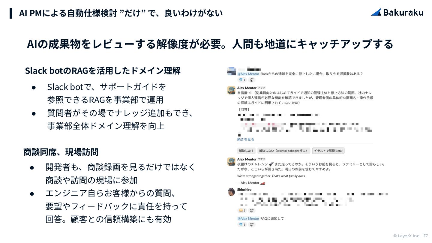 回答。顧客との信頼構築にも有効 AI PMによる⾃動仕様検討 ”だけ” で、良いわけがない Slack botのRAGを活⽤したドメイン理解 • Slack botで、サポートガイドを 参照できるRAGを事業部で運⽤ • 質問者がその場でナレッジ追加もでき、 事業部全体ドメイン理解を向上 商談同席、現場訪問 AIの成果物をレビューする解像度が必要。⼈間も地道にキャッチアップする