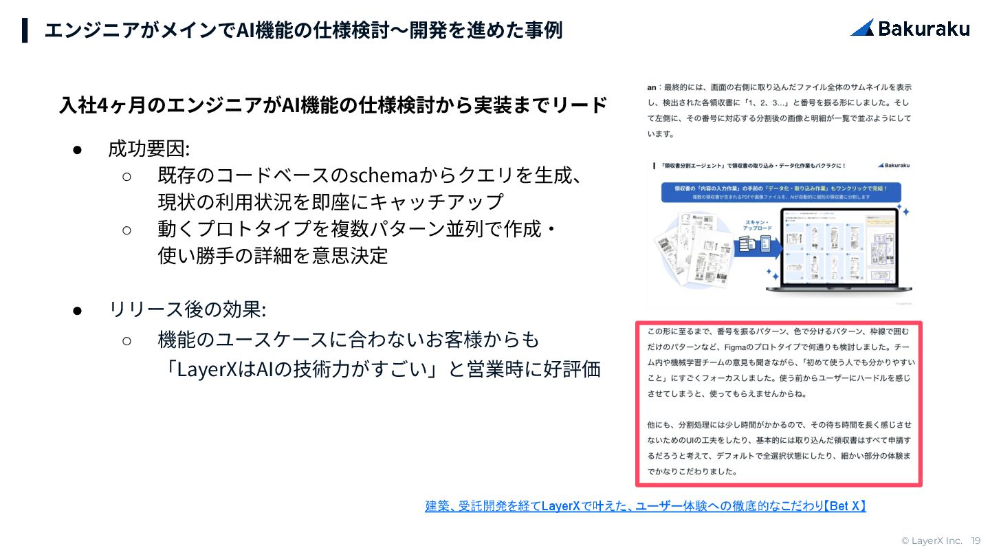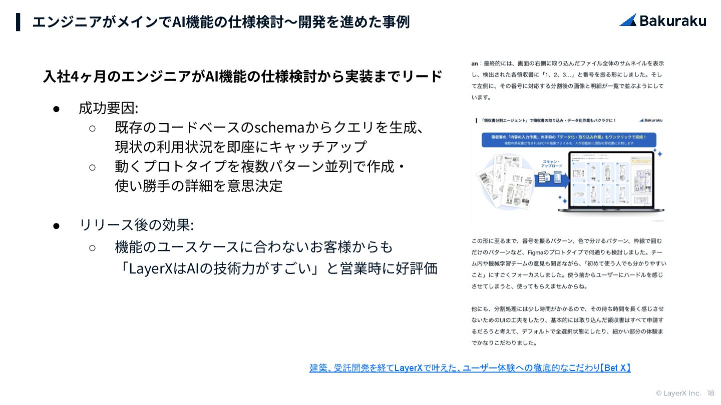 ◦ 動くプロトタイプを複数パターン並列で作成‧ 使い勝⼿の詳細を意思決定 • リリース後の効果: ◦ 機能のユースケースに合わないお客様からも 「LayerXはAIの技術⼒がすごい」と営業時に好評価 エンジニアがメインでAI機能の仕様検討〜開発を進めた事例 建築、受託開発を経てLayerXで叶えた、ユーザー体験への徹底的なこだわり【Bet X】