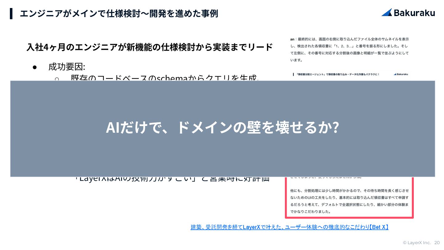 ◦ 既存のコードベースのschemaからクエリを⽣成、 現状の利⽤状況を即座にキャッチアップ ◦ 動くプロトタイプを複数パターン並列で作成‧ 使い勝⼿の詳細を意思決定 ◦ 使いやすいものづくりをしたい強い思い • 効果: ◦ ユースケースに合わないお客様であっても、 「LayerXはAIの技術⼒がすごい」と営業時に好評価 AIだけで、ドメインの壁を壊せるか?