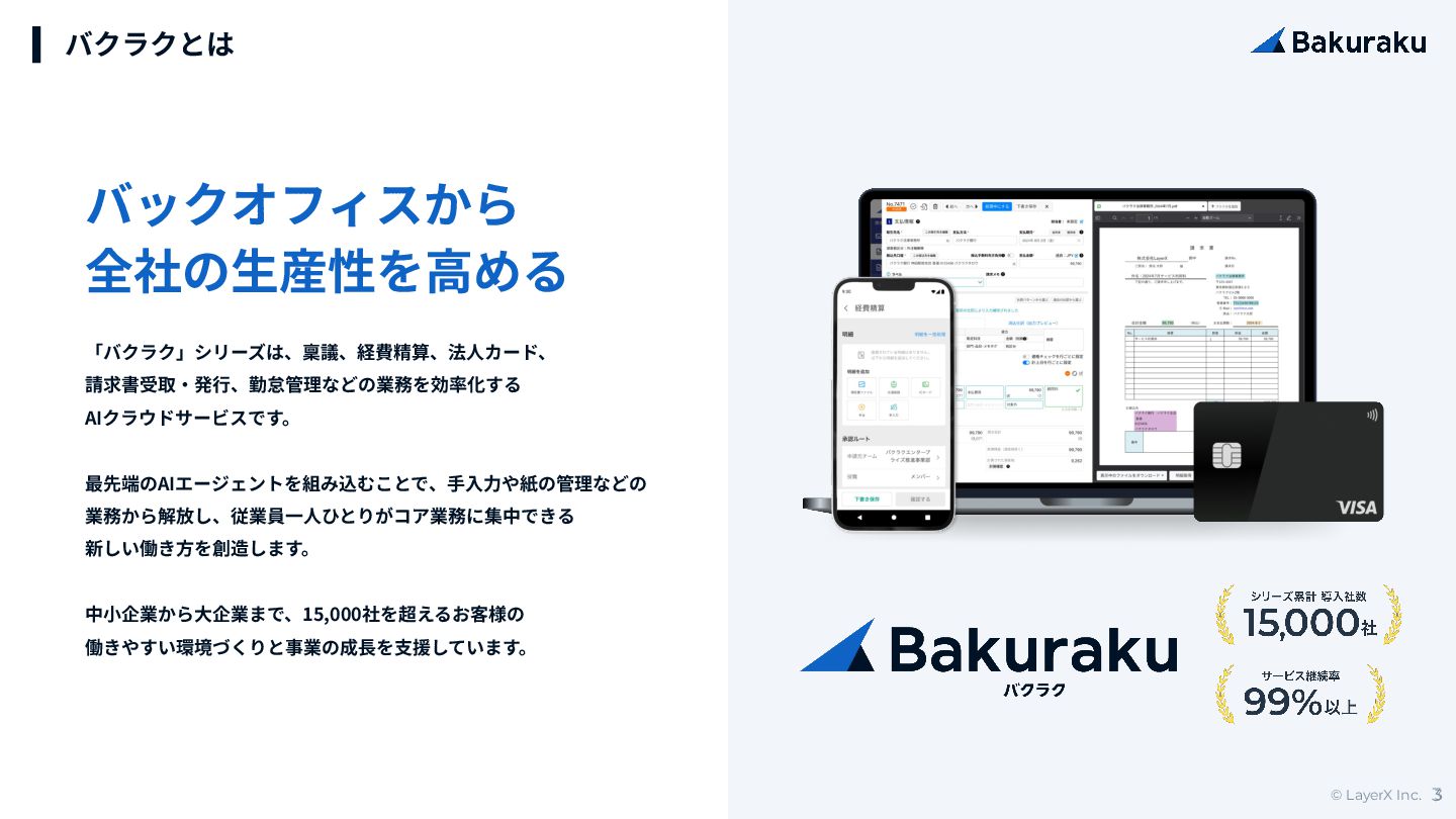 3 © LayerX Inc. 3 バクラクとは 「バクラク」シリーズは、稟議、経費精算、法⼈カード、 請求書受取‧発⾏、勤怠管理などの業務を効率化する AIクラウドサービスです。 最先端のAIエージェントを組み込むことで、⼿⼊⼒や紙の管理などの