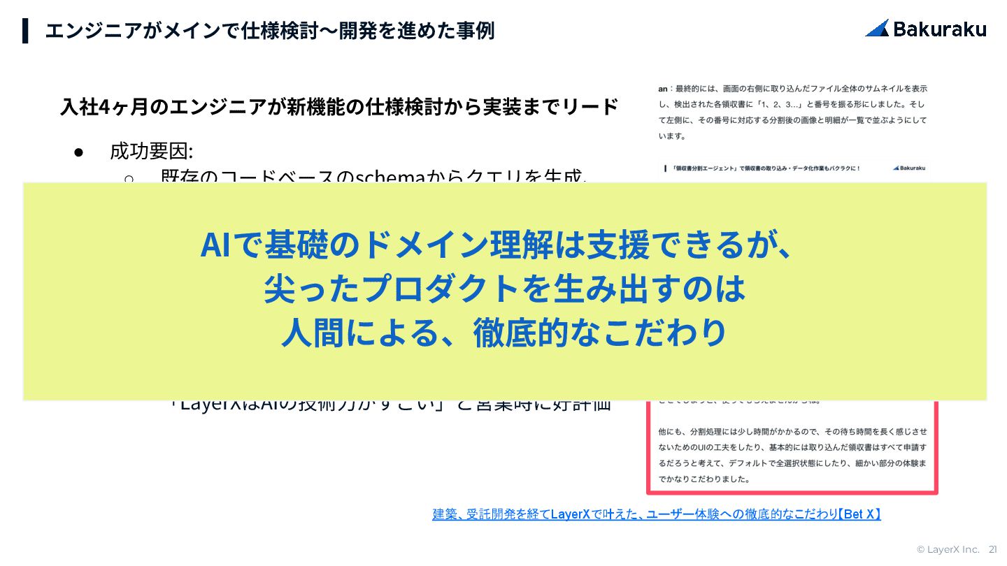 © LayerX Inc. 20 エンジニアがメインで仕様検討〜開発を進めた事例 建築、受託開発を経てLayerXで叶えた、ユーザー体験への徹底的なこだわり【Bet X】 ⼊社4ヶ⽉のエンジニアが新機能の仕様検討から実装までリード • 成功要因: