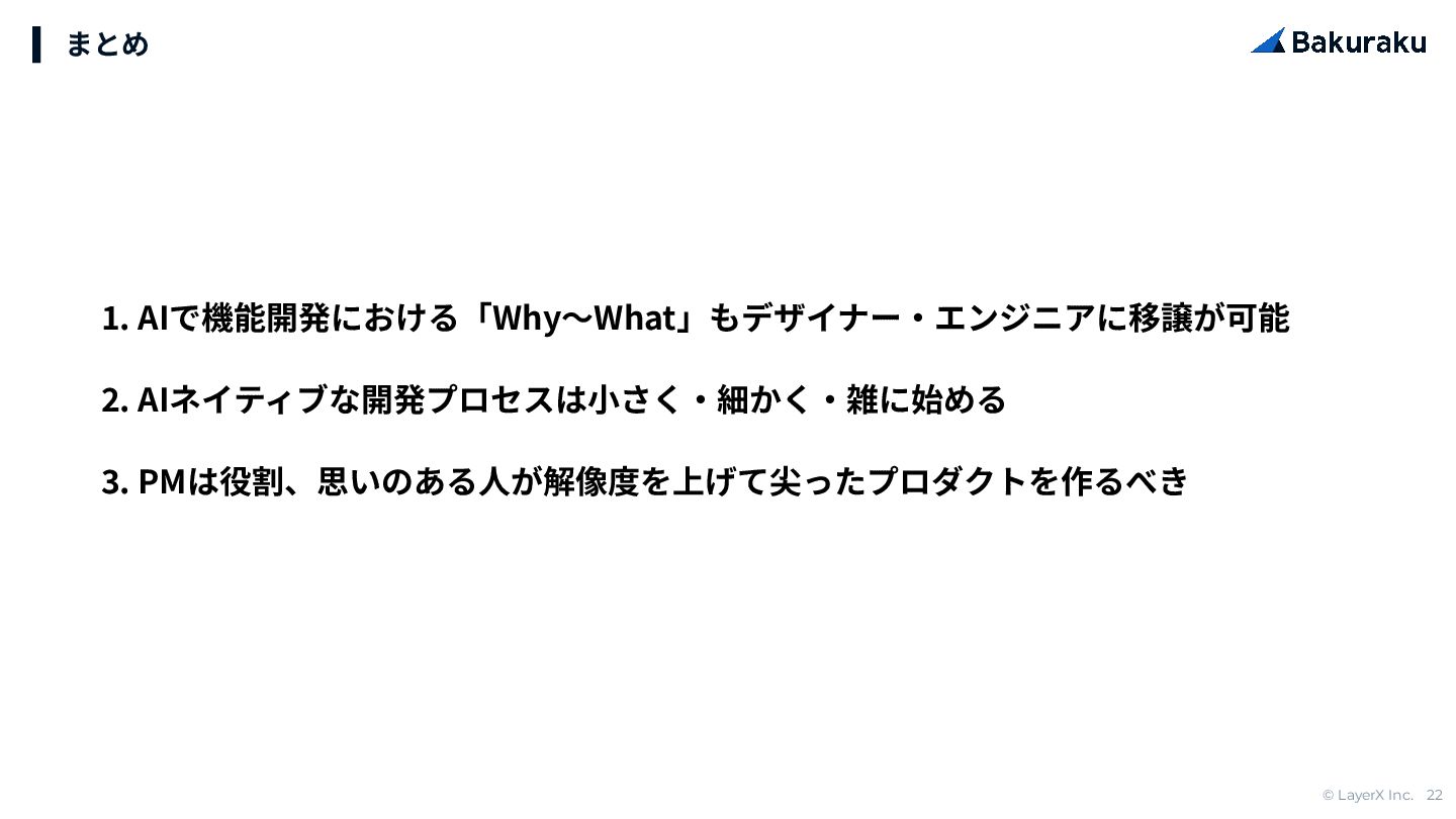 © LayerX Inc. 22 1. AIで機能開発における「Why〜What」もデザイナー‧エンジニアに移譲が可能 2. AIネイティブな開発プロセスは⼩さく‧細かく‧雑に始める 3. PMは役割、思いのある⼈が解像度を上げて尖ったプロダクトを作るべき