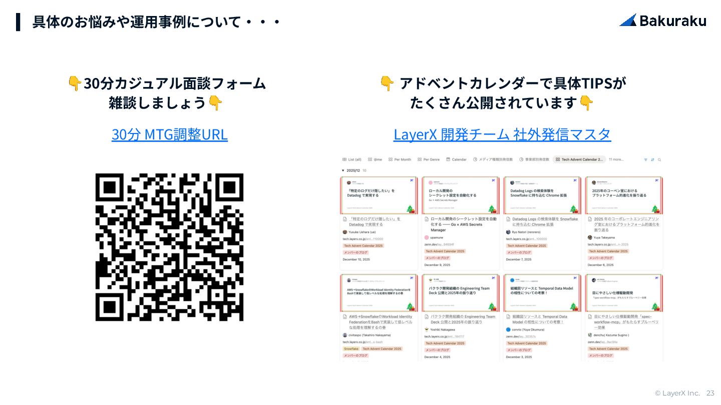 © LayerX Inc. 23 具体のお悩みや運⽤事例について‧‧‧ 👇 アドベントカレンダーで具体TIPSが たくさん公開されています👇 LayerX 開発チーム