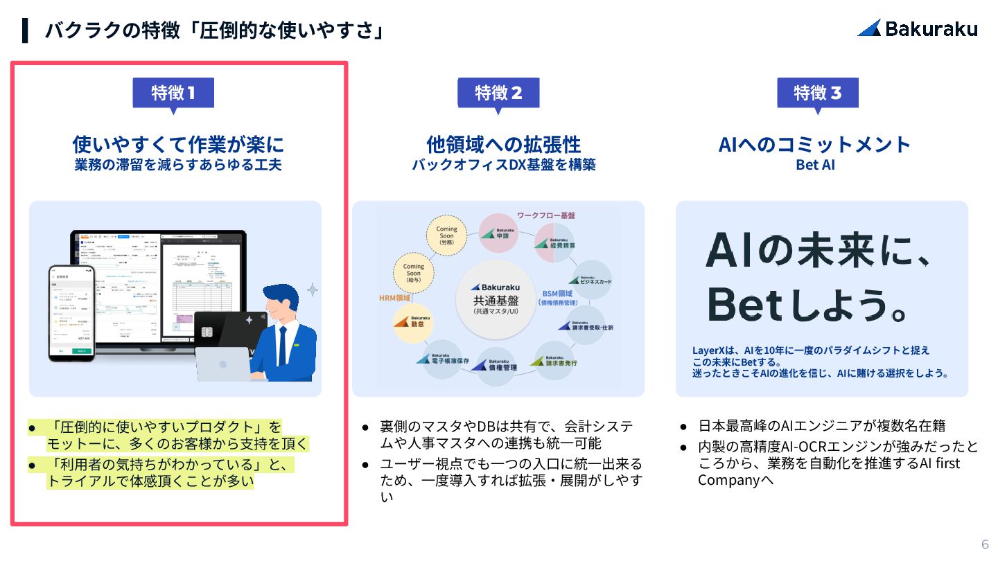 2 特徴 3 他領域への拡張性 バックオフィスDX基盤を構築 • 「圧倒的に使いやすいプロダクト」を モットーに、多くのお客様から⽀持を頂く • 「利⽤者の気持ちがわかっている」と、 トライアルで体感頂くことが多い • ⽇本最⾼峰のAIエンジニアが複数名在籍 • 内製の⾼精度AI-OCRエンジンが強みだったと ころから、業務を⾃動化を推進するAI first Companyへ • 裏側のマスタやDBは共有で、会計システ ムや⼈事マスタへの連携も統⼀可能 • ユーザー視点でも⼀つの⼊⼝に統⼀出来る ため、⼀度導⼊すれば拡張‧展開がしやす い LayerXは、AIを10年に⼀度のパラダイムシフトと捉え この未来にBetする。 迷ったときこそAIの進化を信じ、AIに賭ける選択をしよう。