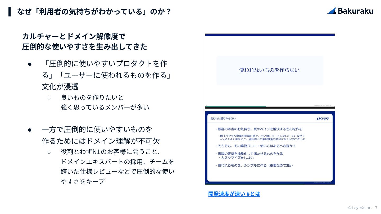 強く思っているメンバーが多い • ⼀⽅で圧倒的に使いやすいものを 作るためにはドメイン理解が不可⽋ ◦ 役割とわずN1のお客様に会うこと、 ドメインエキスパートの採⽤、チームを 跨いだ仕様レビューなどで圧倒的な使い やすさをキープ なぜ「利⽤者の気持ちがわかっている」のか? カルチャーとドメイン解像度で 圧倒的な使いやすさを⽣み出してきた 開発速度が速い #とは