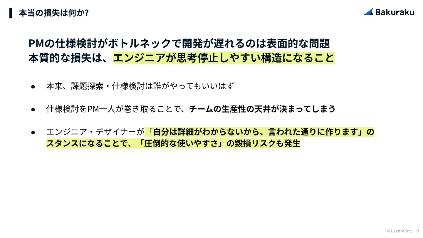スタンスになることで、「圧倒的な使いやすさ」の毀損リスクも発⽣ 本当の損失は何か? PMの仕様検討がボトルネックで開発が遅れるのは表⾯的な問題 本質的な損失は、エンジニアが思考停⽌しやすい構造になること