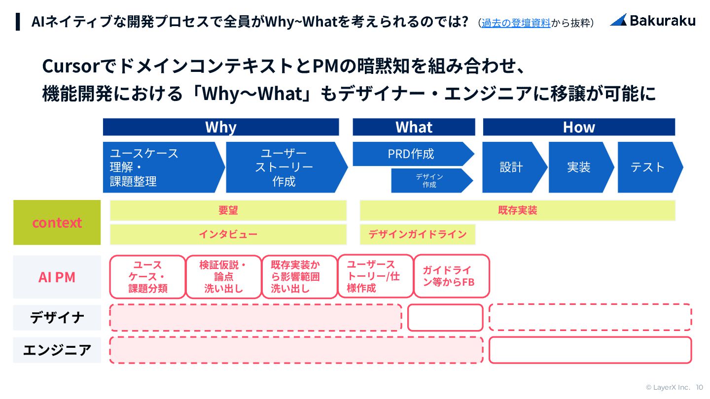 © LayerX Inc. 10 AIネイティブな開発プロセスで全員がWhy~Whatを考えられるのでは? (過去の登壇資料から抜粋) デザイナ エンジニア context 既存実装