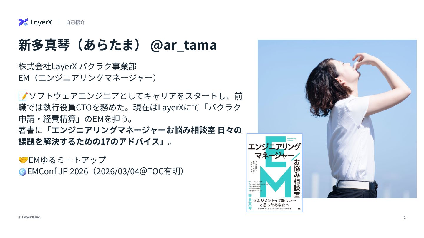 著書に「エンジニアリングマネージャーお悩み相談室 ⽇々の 課題を解決するための17のアドバイス」。 🤝EMゆるミートアップ 🪩EMConf JP 2026(2026/03/04@TOC有明) 新多真琴(あらたま) @ar_tama ⾃⼰紹介