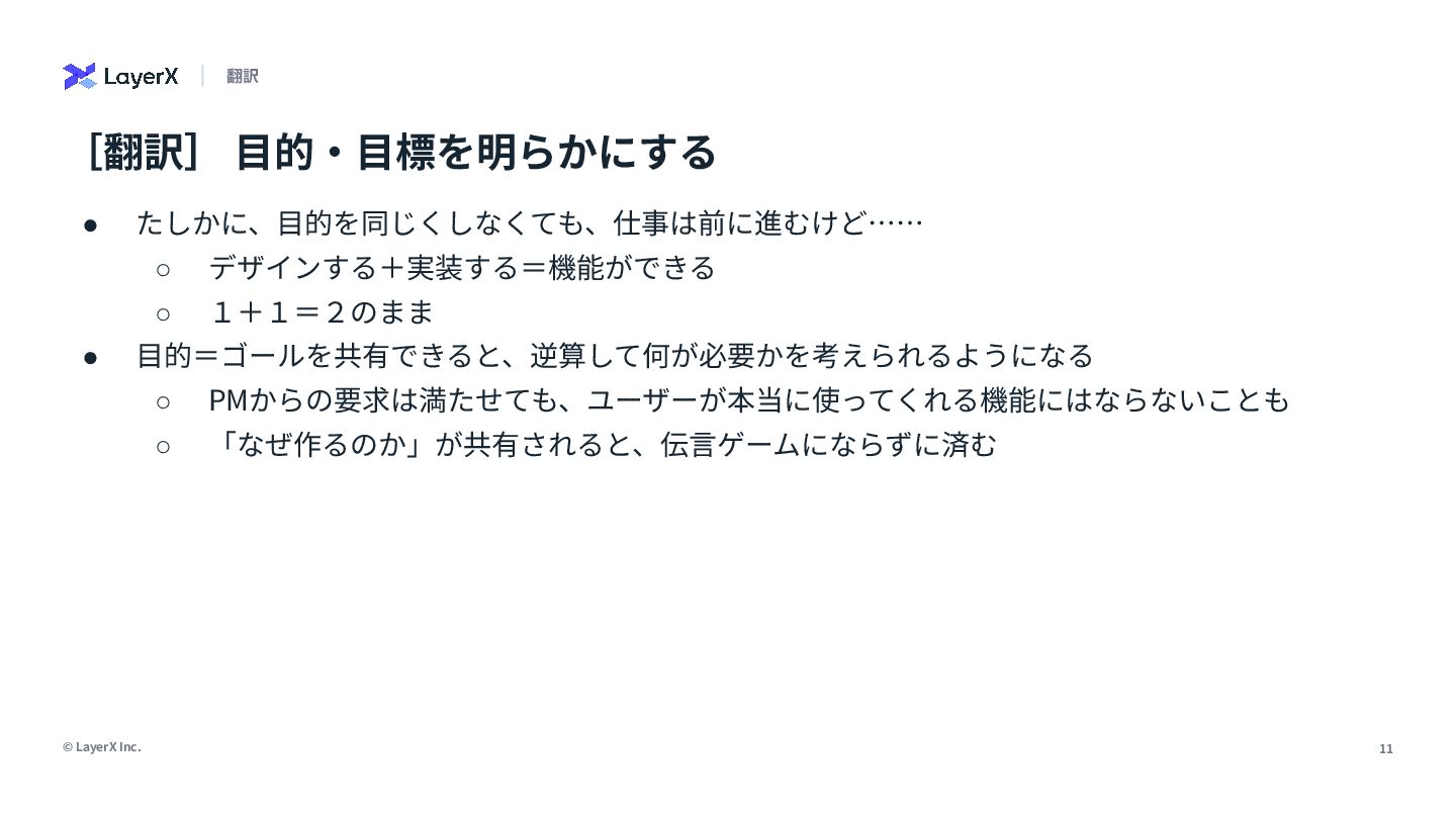 4. 11 © LayerX Inc. [翻訳] ⽬的‧⽬標を明らかにする • たしかに、⽬的を同じくしなくても、仕事は前に進むけど…… ◦ デザインする+実装する=機能ができる
