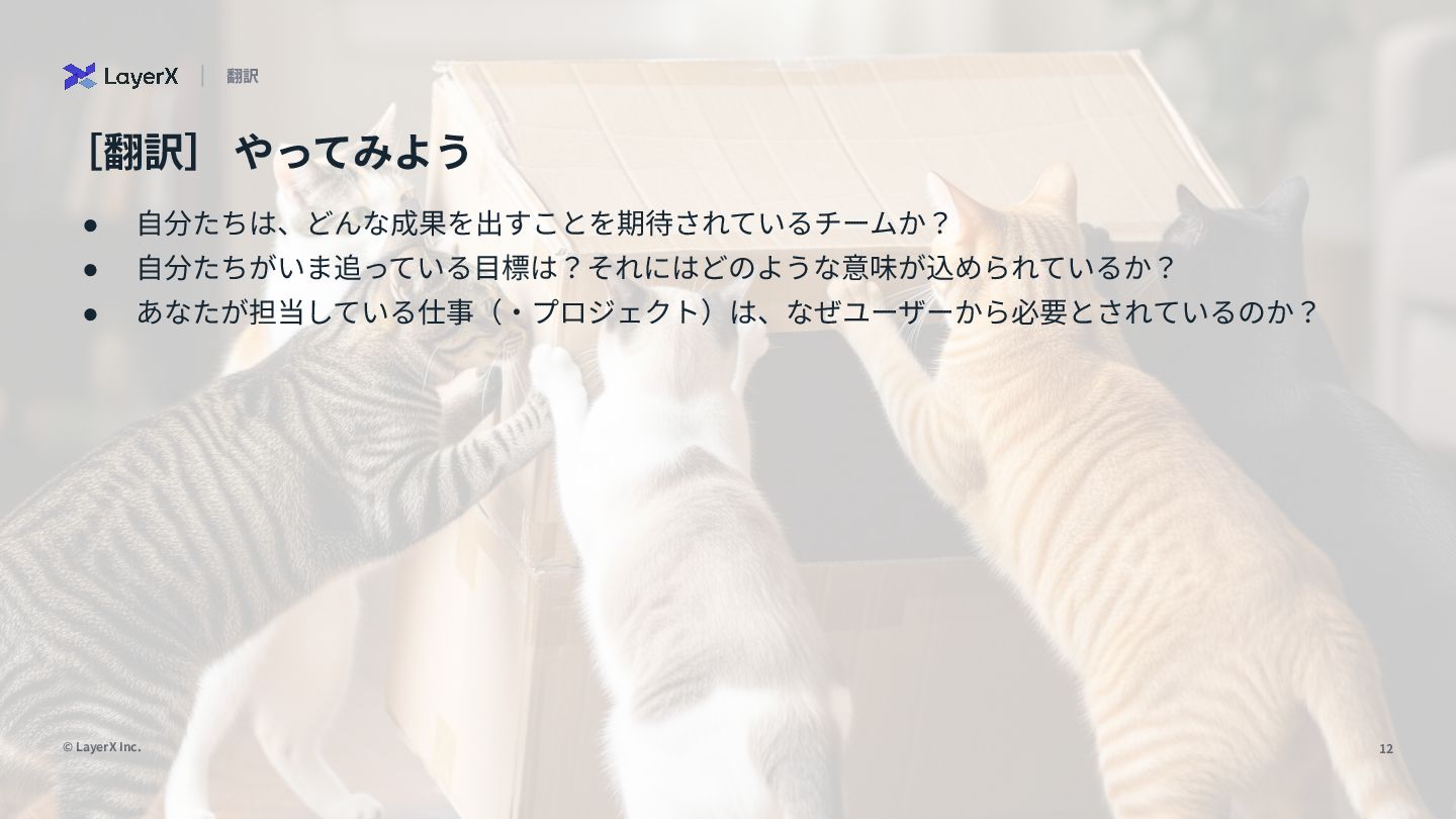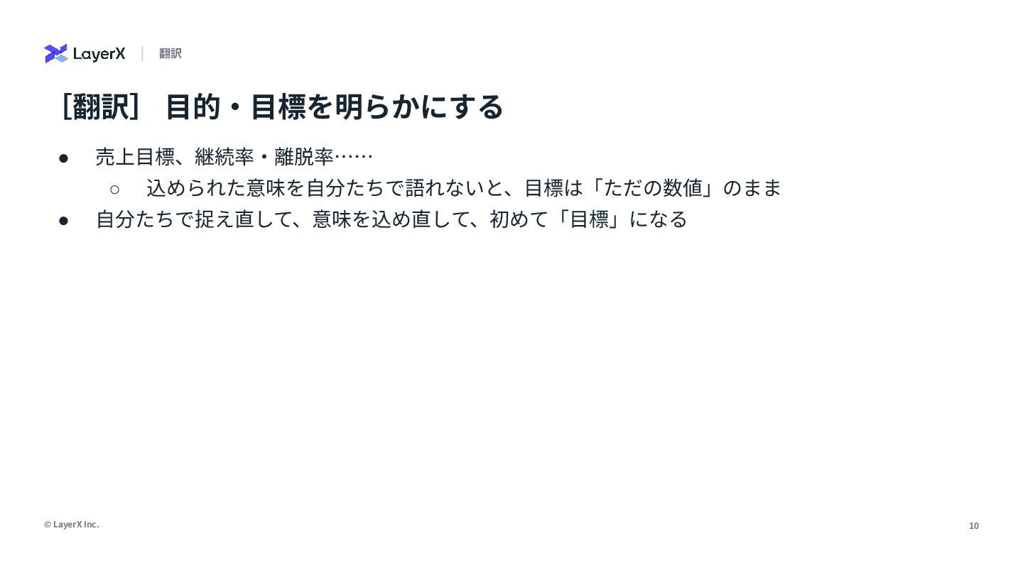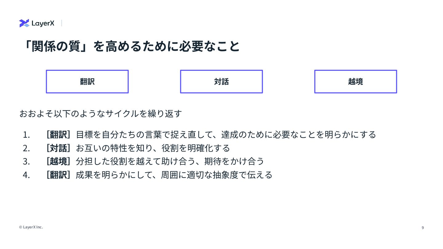 3. 9 © LayerX Inc. おおよそ以下のようなサイクルを繰り返す 1. [翻訳]⽬標を⾃分たちの⾔葉で捉え直して、達成のために必要なことを明らかにする 2. [対話]お互いの特性を知り、役割を明確化する 3.