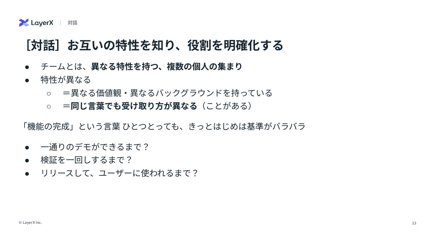 ◦ =同じ⾔葉でも受け取り⽅が異なる(ことがある) 「機能の完成」という⾔葉 ひとつとっても、きっとはじめは基準がバラバラ • ⼀通りのデモができるまで? • 検証を⼀回しするまで? • リリースして、ユーザーに使われるまで? [対話]お互いの特性を知り、役割を明確化する 対話