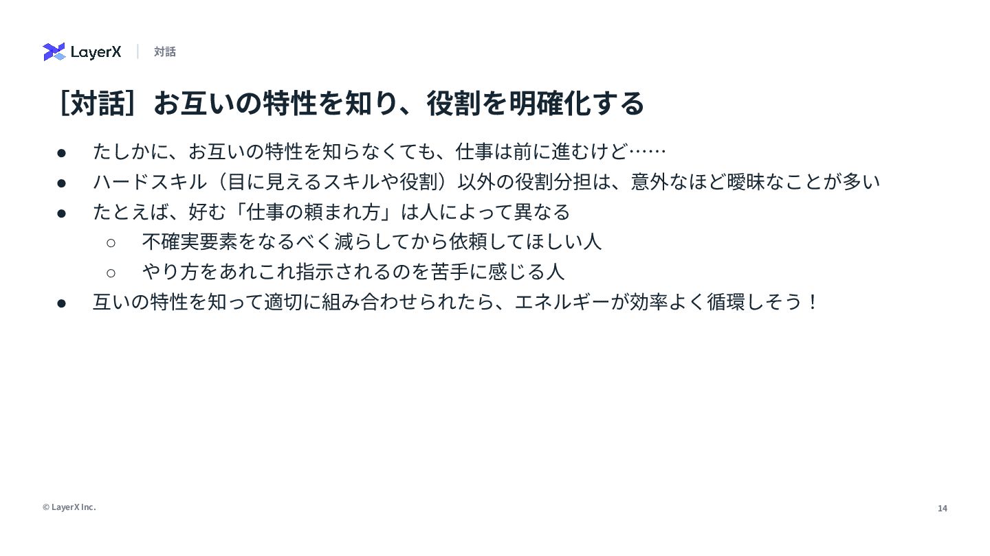 6. 14 © LayerX Inc. • たしかに、お互いの特性を知らなくても、仕事は前に進むけど…… • ハードスキル(⽬に⾒えるスキルや役割)以外の役割分担は、意外なほど曖昧なことが多い • たとえば、好む「仕事の頼まれ⽅」は⼈によって異なる