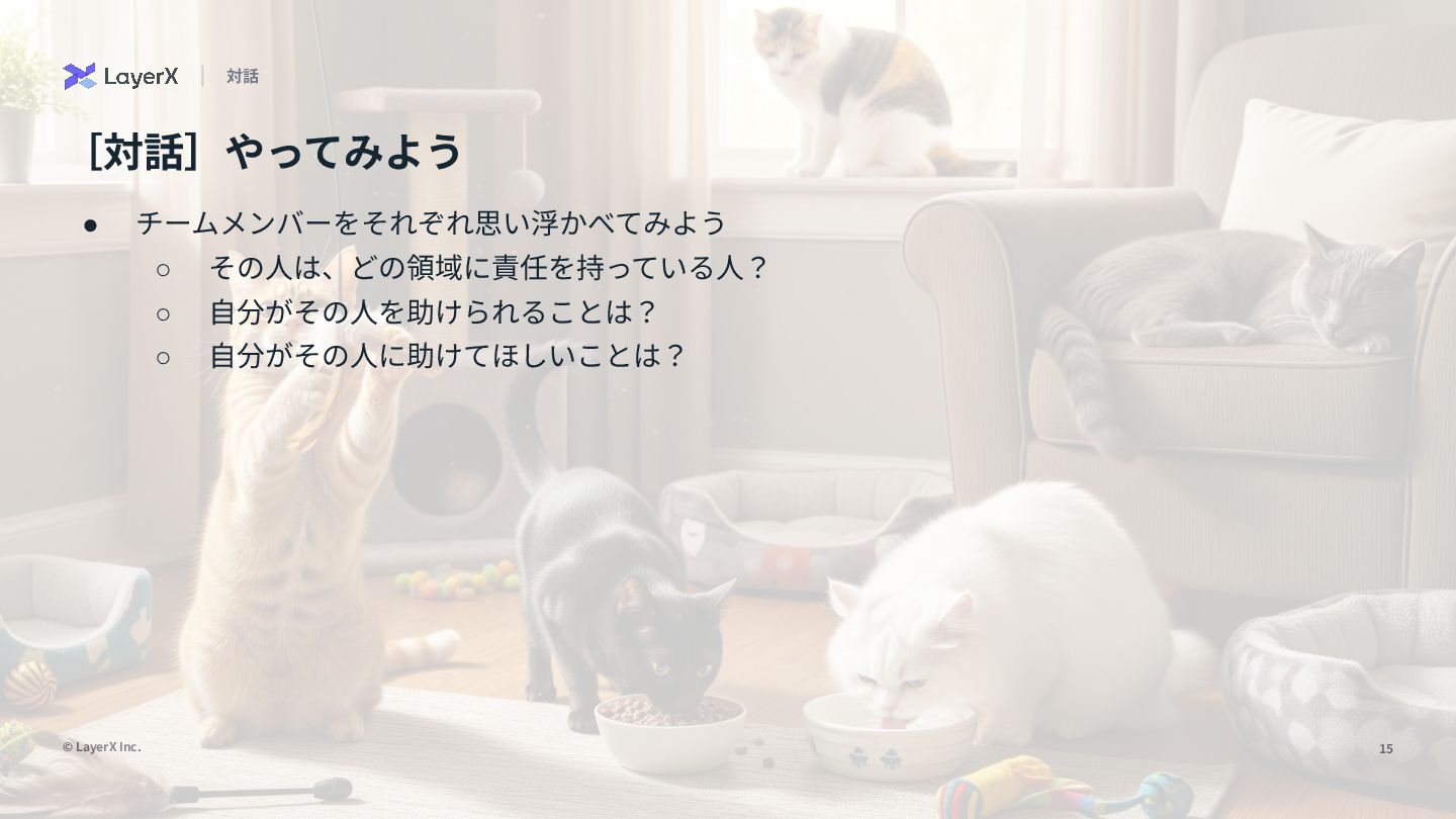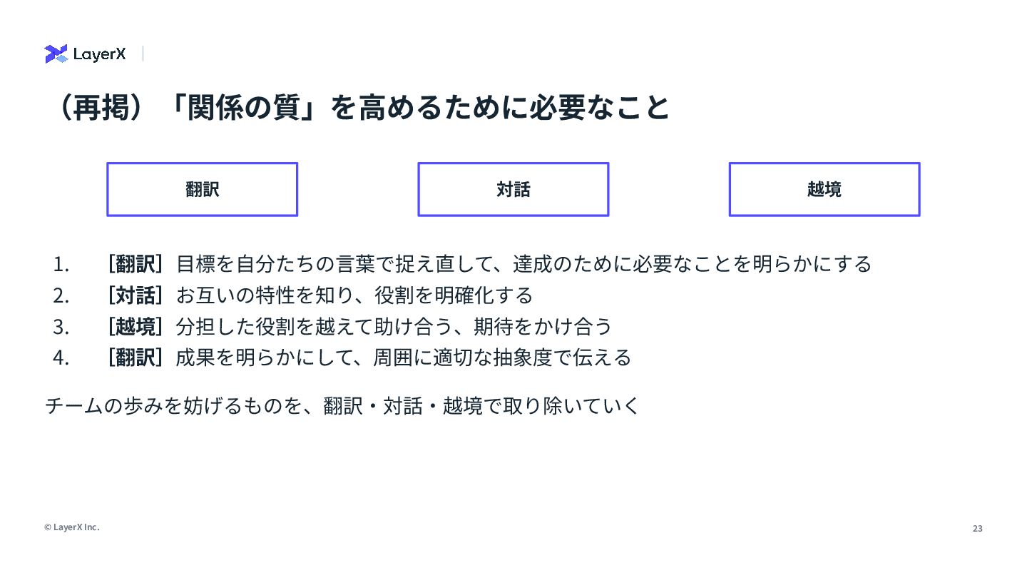 10. 23 © LayerX Inc. 1. [翻訳]⽬標を⾃分たちの⾔葉で捉え直して、達成のために必要なことを明らかにする 2. [対話]お互いの特性を知り、役割を明確化する 3. [越境]分担した役割を越えて助け合う、期待をかけ合う
