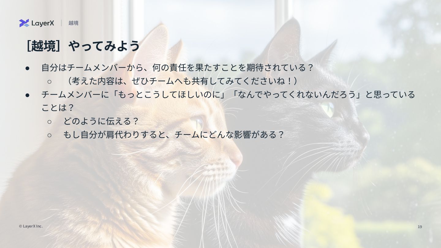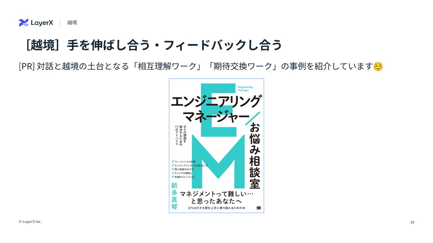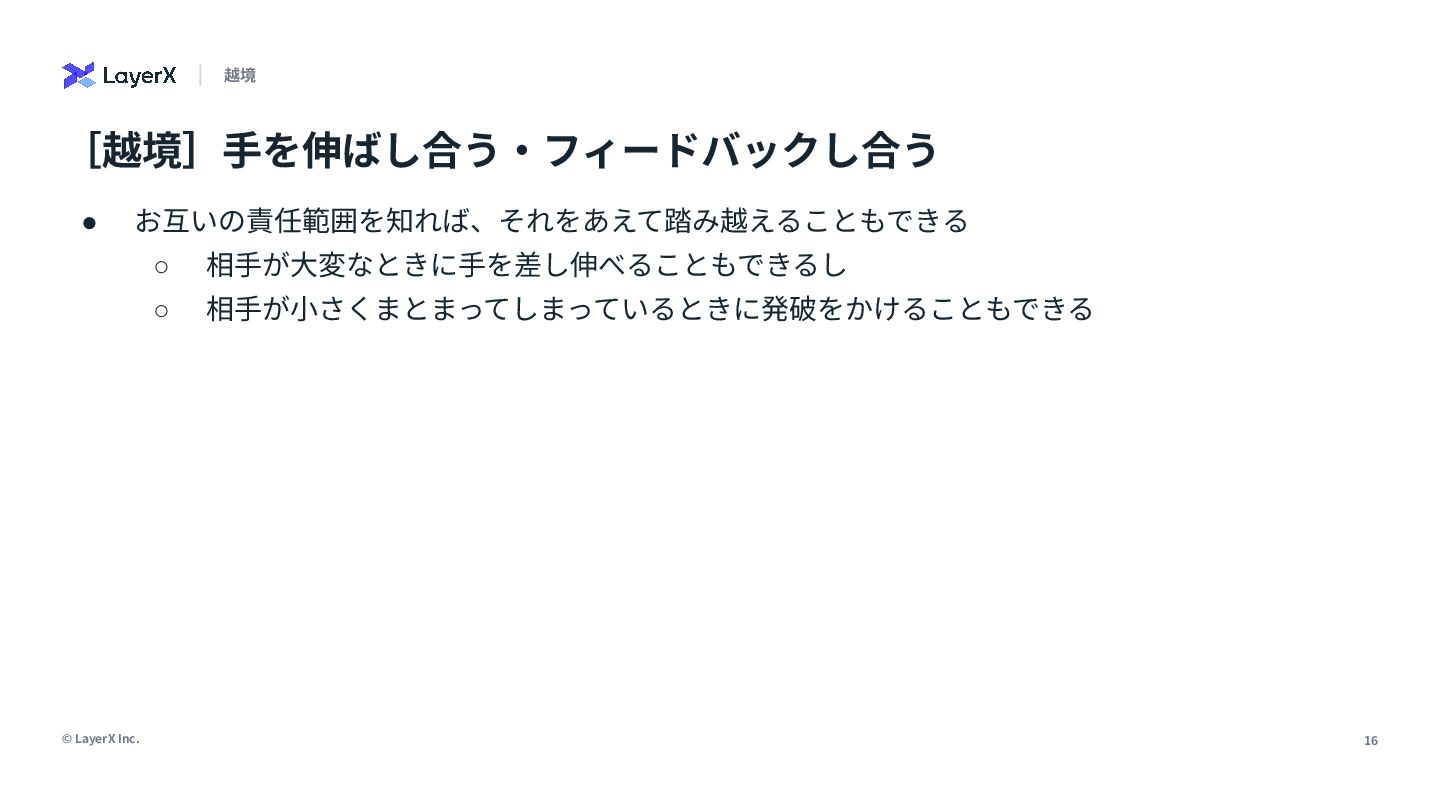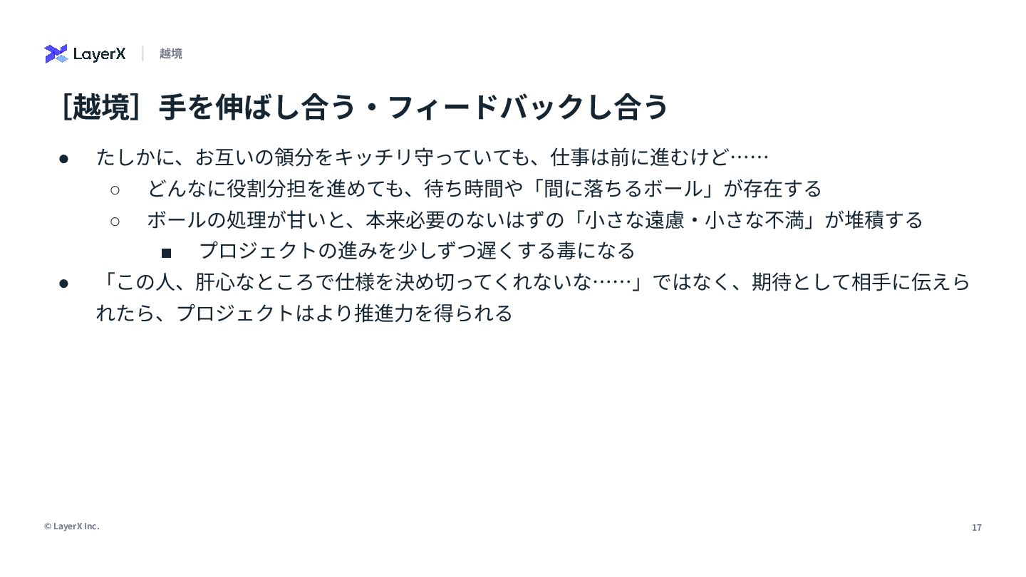 ▪ プロジェクトの進みを少しずつ遅くする毒になる • 「この⼈、肝⼼なところで仕様を決め切ってくれないな……」ではなく、期待として相⼿に伝えら れたら、プロジェクトはより推進⼒を得られる [越境]⼿を伸ばし合う‧フィードバックし合う 越境