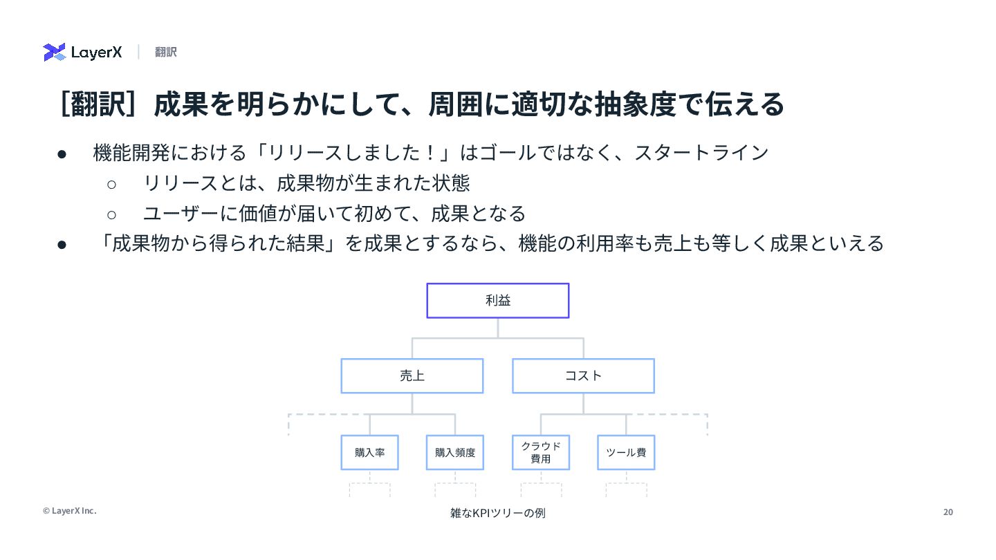 • 「成果物から得られた結果」を成果とするなら、機能の利⽤率も売上も等しく成果といえる [翻訳]成果を明らかにして、周囲に適切な抽象度で伝える 翻訳 利益 コスト 売上 購⼊率 購⼊頻度 クラウド 費⽤ ツール費 雑なKPIツリーの例