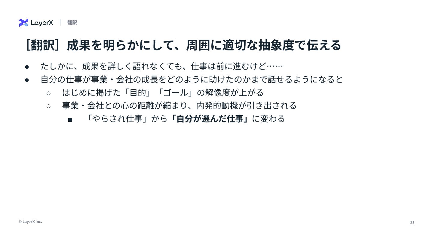 ◦ 事業‧会社との⼼の距離が縮まり、内発的動機が引き出される ▪ 「やらされ仕事」から「⾃分が選んだ仕事」に変わる [翻訳]成果を明らかにして、周囲に適切な抽象度で伝える 翻訳
