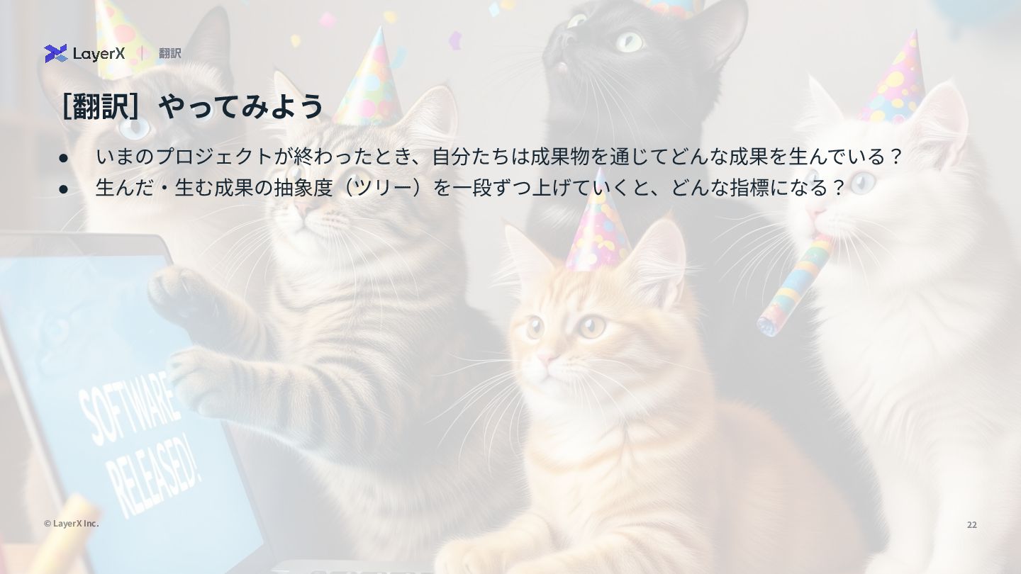 9. 21 © LayerX Inc. • たしかに、成果を詳しく語れなくても、仕事は前に進むけど…… • ⾃分の仕事が事業‧会社の成⻑をどのように助けたのかまで話せるようになると ◦ はじめに掲げた「⽬的」「ゴール」の解像度が上がる