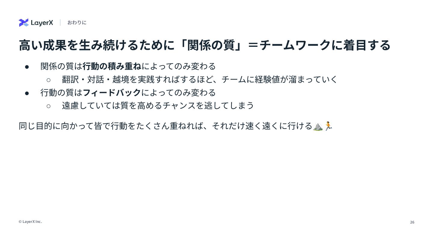 11. 26 © LayerX Inc. • 関係の質は⾏動の積み重ねによってのみ変わる ◦ 翻訳‧対話‧越境を実践すればするほど、チームに経験値が溜まっていく • ⾏動の質はフィードバックによってのみ変わる