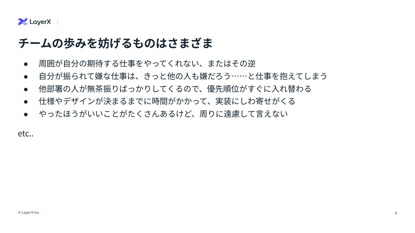 2. 8 © LayerX Inc. • 周囲が⾃分の期待する仕事をやってくれない、またはその逆 • ⾃分が振られて嫌な仕事は、きっと他の⼈も嫌だろう……と仕事を抱えてしまう • 他部署の⼈が無茶振りばっかりしてくるので、優先順位がすぐに⼊れ替わる