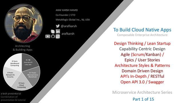 of presentation & tutorial ARAF KARSH HAMID Co-Founder / CTO MetaMagic Global Inc., NJ, USA @arafkarsh arafkarsh AI / ML Generative AI LLMs, RAG 6+ Years Microservices Blockchain 8 Years Cloud Computing 8 Years Network & Security 8 Years Distributed Computing 1 Design Thinking / Lean Startup Capability Centric Design Agile (Scrum/Kanban) / Epics / User Stories Architecture Styles & Patterns Domain Driven Design API’s In-Depth / RESTful Open API 3.0 / Swagger Microservice Architecture Series Part 1 of 15 To Build Cloud Native Apps Composable Enterprise Architecture