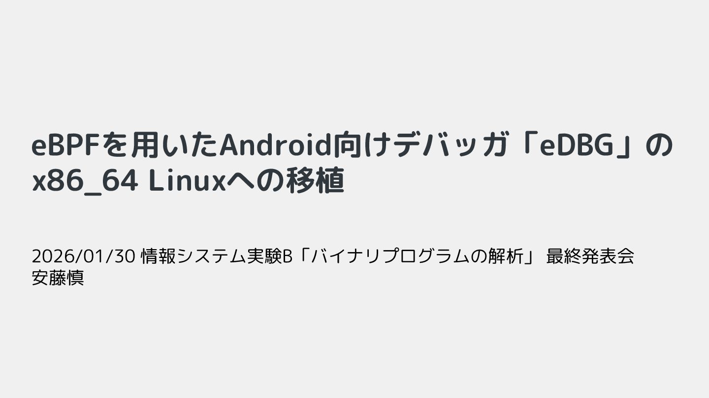 eBPFを用いたAndroid向けデバッガ「eDBG」の x86_64 Linuxへの移植 2026/01/30 情報システム実験B「バイナリプログラムの解析」 最終発表会 安藤慎