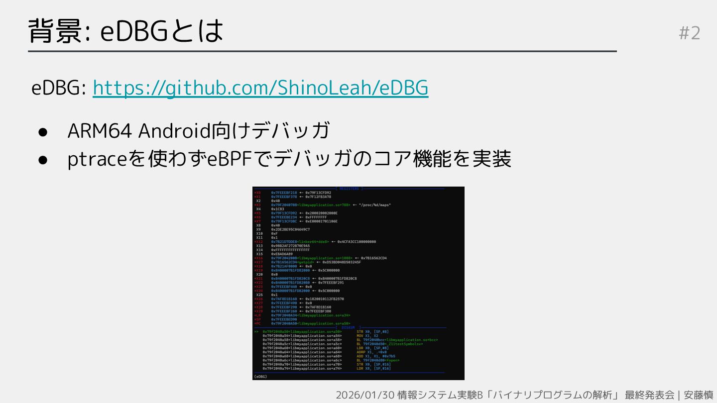 2026/01/30 情報システム実験B「バイナリプログラムの解析」 最終発表会 | 安藤慎 eDBG: https://github.com/ShinoLeah/eDBG • ARM64 Android向けデバッガ