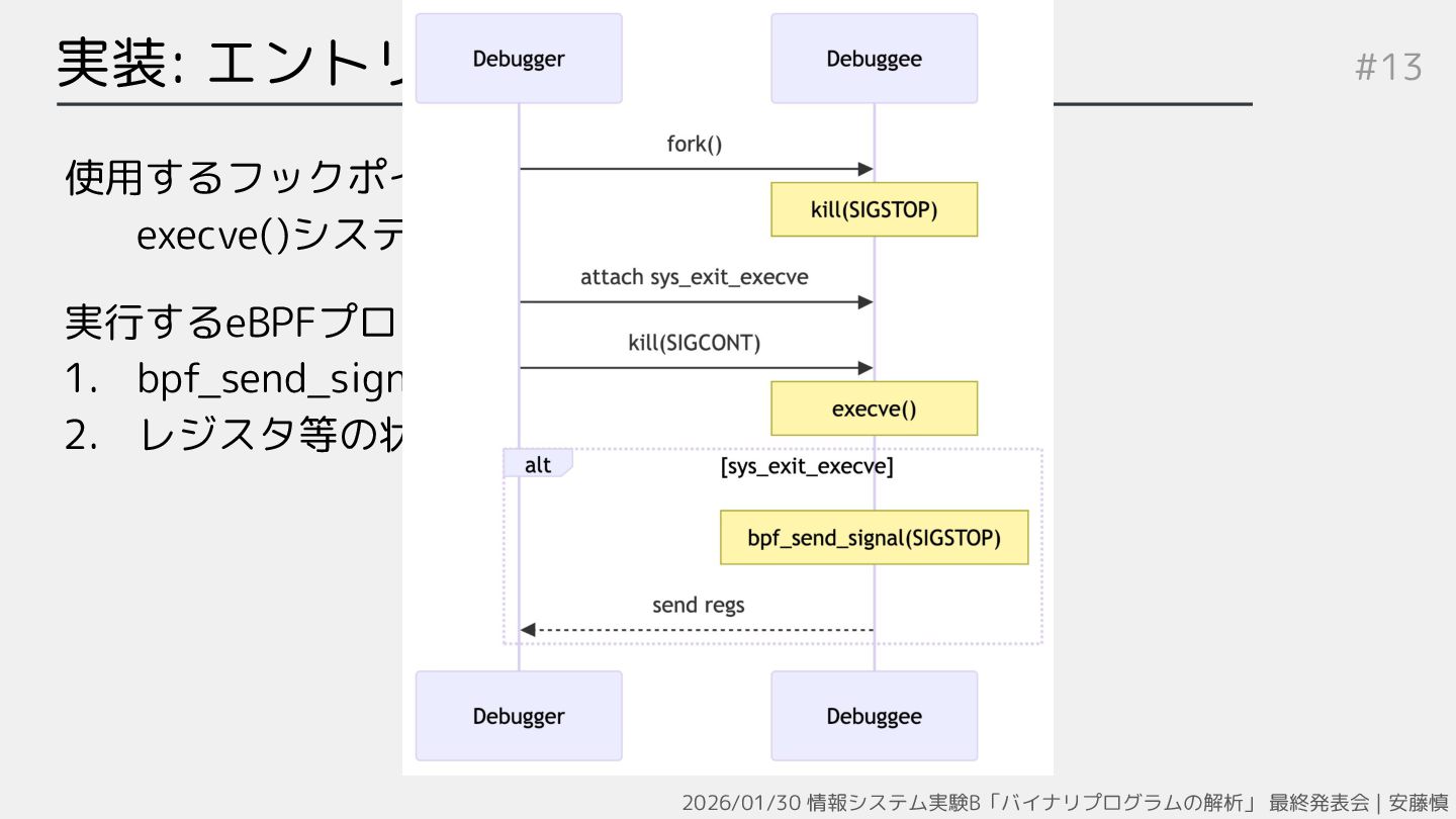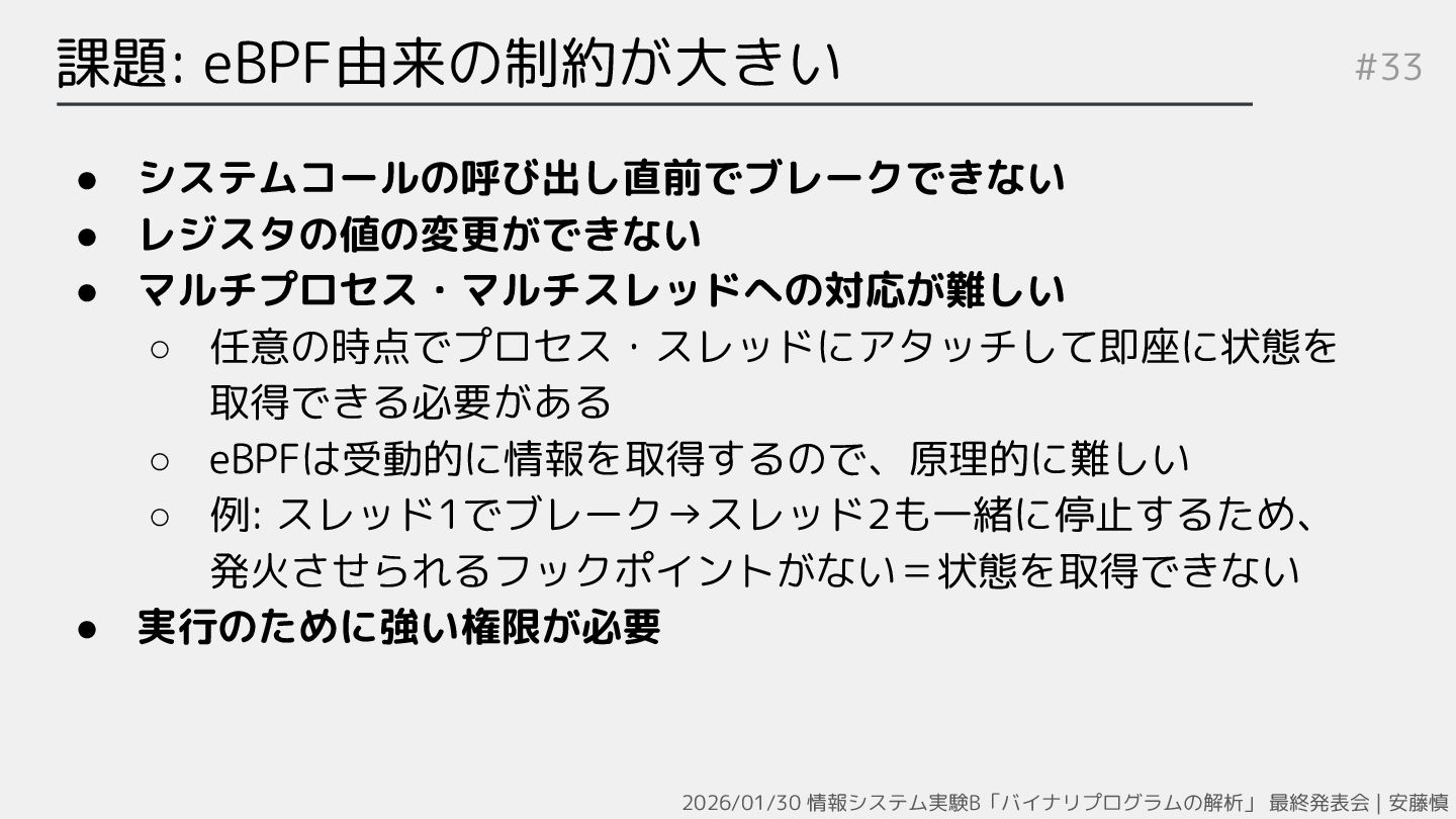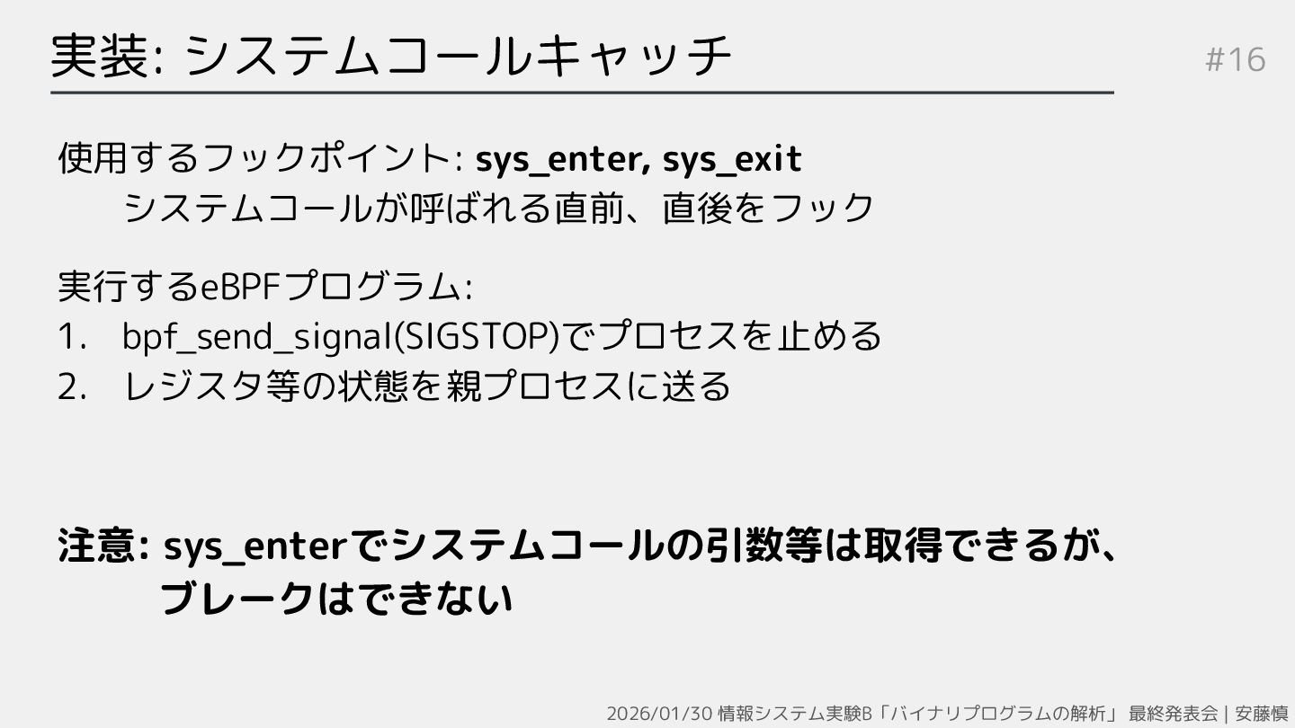 2026/01/30 情報システム実験B「バイナリプログラムの解析」 最終発表会 | 安藤慎 eBPFでは特定のシステムコール呼び出しに限ってSIGSTOPを送ることが 可能なためと思われる • ptrace(PTRACE_SYSCALL)はすべてのシステムコールでブレークする ◦