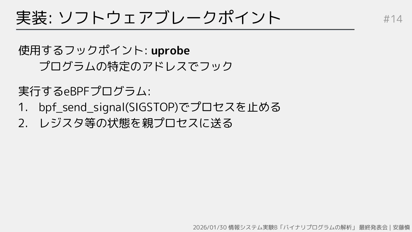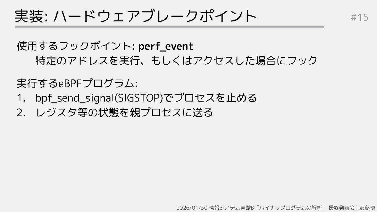 2026/01/30 情報システム実験B「バイナリプログラムの解析」 最終発表会 | 安藤慎 使用するフックポイント: perf_event 特定のアドレスを実行、もしくはアクセスした場合にフック 実行するeBPFプログラム: 1.