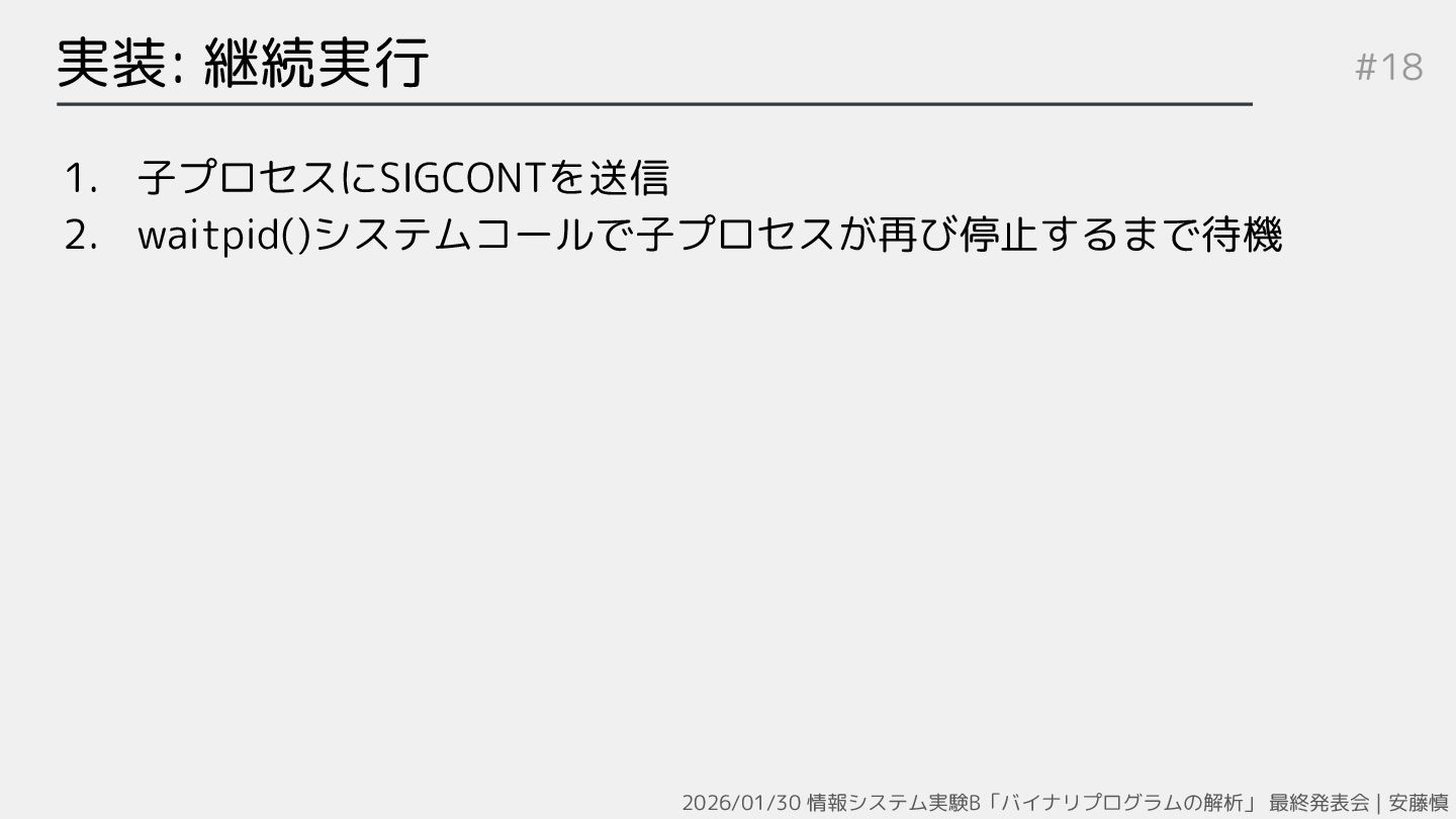 2026/01/30 情報システム実験B「バイナリプログラムの解析」 最終発表会 | 安藤慎 1. 子プロセスにSIGCONTを送信 2. waitpid()システムコールで子プロセスが再び停止するまで待機 実装: